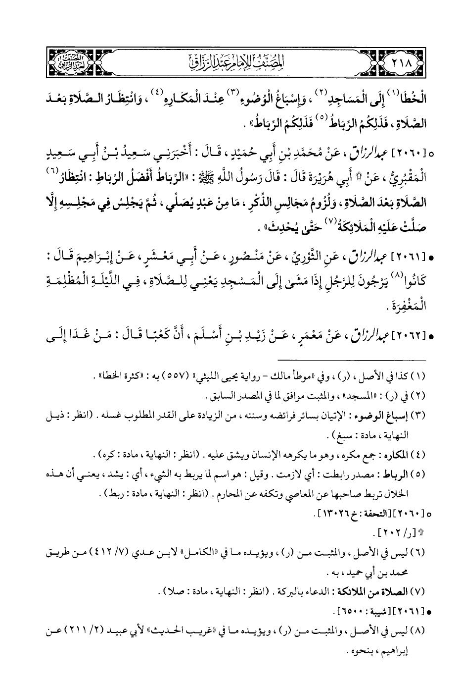(¬٥) الرباط: مصدر رابطت: أي لازمت. وقيل: هو اسم لما يربط به الشيء، أي: يشد، يعني أن هذه الخلال تربط صاحبها عن المعاصي وتكفه عن المحارم. (انظر: النهاية، مادة: ربط).