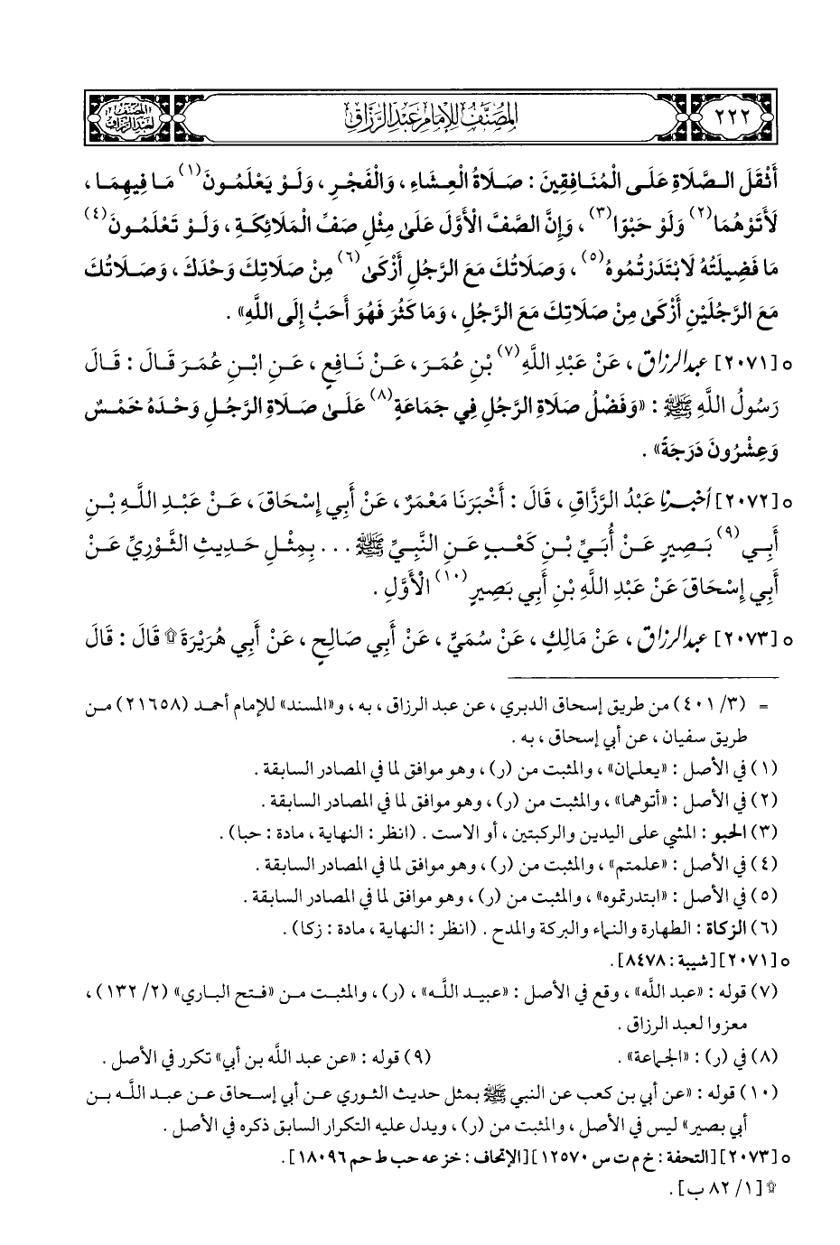 ° [٢٠٧١] عبد الرزاق، عَنْ عَبْدِ اللَّهِ (¬٧) بْنِ عُمَرَ، عَنْ نَافِعٍ، عَنِ ابْنِ عُمَرَ قَالَ: قَالَ رَسُولُ اللَّهِ - صلى الله عليه وسلم -: "وَفَضْلُ صَلَاةِ الرَّجُلِ فِي جَمَاعَةٍ (¬٨) عَلَى صَلَاةِ الرَّجُلِ وَحْدَهُ خَمْسٌ وَعِشْرُونَ دَرَجَةً".