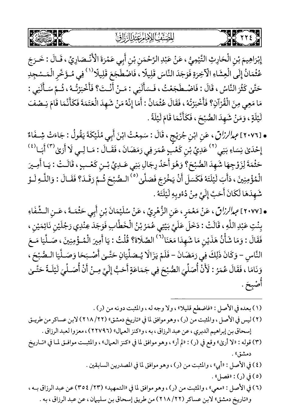 • [٢٠٧٧] عبد الرزاق، عَنْ مَعْمَرٍ، عَنِ الزُّهْرِيِّ، عَنْ سُلَيْمَانَ بْنِ أَبِي حَثْمَةَ، عَنِ الشِّفَاءِ بِنْتِ عَبْدِ اللَّهِ، قَالَتْ: دَخَلَ عَلَيَّ بَيْتِي عُمَرُ بْنُ الْخَطَّابِ فَوَجَدَ عِنْدِي رَجُلَيْنِ نَائِمَيْنِ، فَقَالَ: وَمَا شَأْنُ هَذَيْنِ مَا شَهِدَا مَعَنَا (¬٦) الصَّلَاةَ؟ قُلْتُ: يَا أَمِيرَ الْمُؤْمِنِينَ، صَلَّيَا مَعَ النَّاسِ - وَكَانَ ذَلِكَ فِي رَمَضَانَ - فَلَمْ يَزَالَا يُصَلِّيَانِ حَتَّى أَصْبَحَا وَصَلَّيَا الصُّبْحَ، وَنَامَا، فَقَالَ عُمَز: لأَنْ أُصَلِّيَ الصُّبْحَ فِي جَمَاعَةٍ أَحَبُّ إِلَيَّ مِنْ أَنْ أُصَلِّيَ لَيلَة حَتَّى أُصْبحَ.