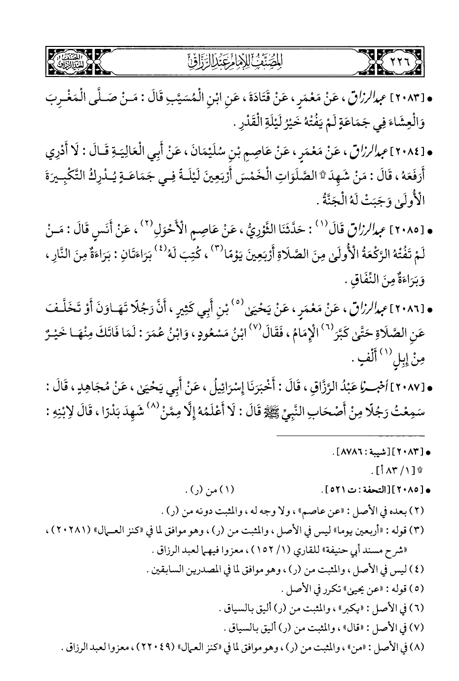 • [٢٠٨٥] عبد الرزاق، قَالَ (¬١): حَدَّثَنَا الثَّوْريُّ، عَنْ عَاصِمٍ الْأَحْوَلِ (¬٢)، عَنْ أَنَسٍ قَالَ: مَنْ لَمْ تَفُتْهُ الرَّكْعَةُ الْأُولَى مِنَ الصلَاةِ أَرْبَعِينَ يَوْمًا (¬٣)، كُتِبَ لَهُ (¬٤) بَرَاءَتَانِ: بَرَاءَةٌ مِنَ النَّارِ، وَبَرَاءَةٌ مِنَ النِّفَاقِ.