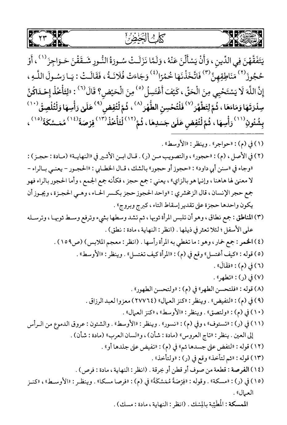 يَتَفَقَّهْنَ فِي الدِّينِ، وَأَنْ يَسْأَلْنَ عَنْهُ، وَلَمَّا نَزَلَتْ سُورَةُ النُّورِ شَقَقْنَ حَوَاجِزَ (¬١)، أَوْ حُجُوزَ (¬٢) مَنَاطِقِهِنَّ (¬٣) فَاتَّخَذْنَهَا خُمُرًا (¬٤) وَجَاءَتْ فُلَانَةُ، فَقَالَتْ: يَا رَسُولَ اللهِ، إِنَّ اللهَ لَا يَسْتَحْيِي مِنَ الْحَقِّ، كَيْفَ أَغْتَسِلُ (¬٥) مِنَ الْحَيْضِ؟ قَالَ (¬٦): "لِتَأْخُذْ إِحْدَاكُنَّ سِدْرَتَهَا وَمَاءَهَا، ثُمَّ لِتَطَّهَّرَ (¬٧) فَلْتُحْسِنِ الطُّهْرَ (¬٨)، ثُمَّ لْتُفِضِ (¬٩) عَلَى رَأْسِهَا وَلْتُلْصِقْ (¬١٠) بِشُئُونِ (¬١١) رَأْسِهَا، ثُمَّ لْتُفِضِ عَلَى جَسَدِهَا، ثُمَّ (¬١٢) لْتَأْخُذْ (¬١٣) فِرْصَةً (¬١٤) مُمَسَّكَةً (¬١٥) ,