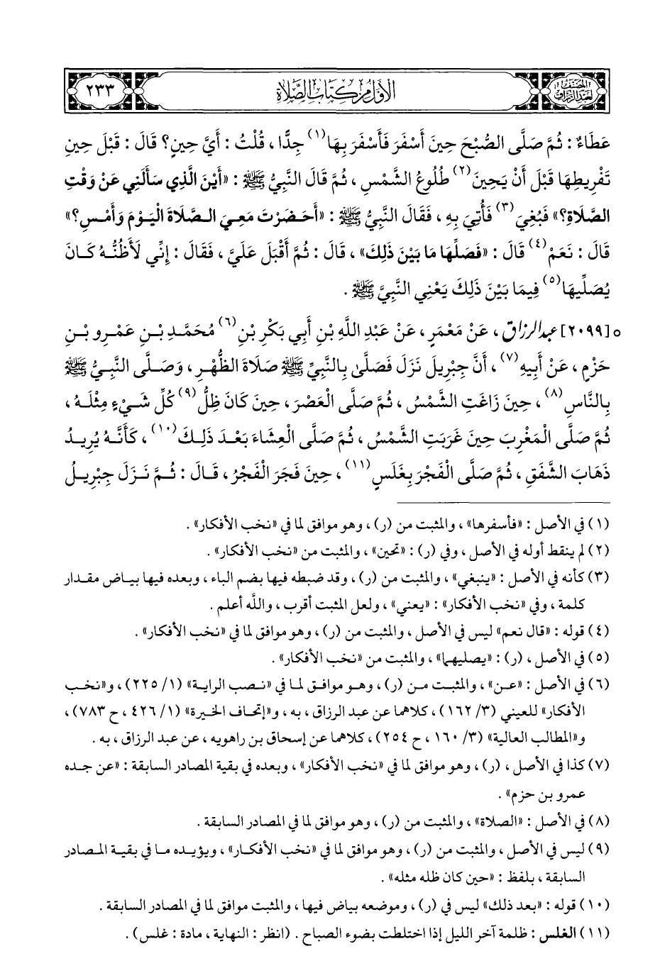 ° [٢٠٩٩] عبد الرزاق، عَنْ مَعْمَرٍ، عَنْ عَبْدِ اللهِ بْنِ أَبِي بَكْرِ بْنِ (¬٦) مُحَمَّدِ بْنِ عَمْرِو بْنِ حَزْمٍ، عَنْ أَبِيهِ (¬٧)، أَنَّ جِبْرِيلَ نَزَلَ فَصَلَّى بِالنَّبِيِّ - صلى الله عليه وسلم - صلَاةَ الظُّهْرِ، وَصَلَّى النَّبِيُّ - صلى الله عليه وسلم - بِالنَّاسِ (¬٨)، حِينَ زَاغَتِ الشَّمْسُ، ثُمَّ صَلَّى الْعَصْرَ، حِينَ كَانَ ظِلُّ (¬٩) كُلِّ شَيْءٍ مِثْلَهُ، ثُمَّ صَلَّى الْمَغْرِبَ حِينَ غَرَبَتِ الشَّمْسُ، ثُمَّ صَلَّى الْعِشَاءَ بَعْدَ ذَلِكَ (¬١٠)، كَأَنَّهُ يُرِيدُ ذَهَابَ الشَّفَقِ، ثُمَّ صَلَّى الْفَجْرَ بِغَلَسٍ (¬١١)، حِينَ فَجَرَ الْفَجْرُ، قَالَ: ثُمَّ نَزَلَ جِبْرِيلُ