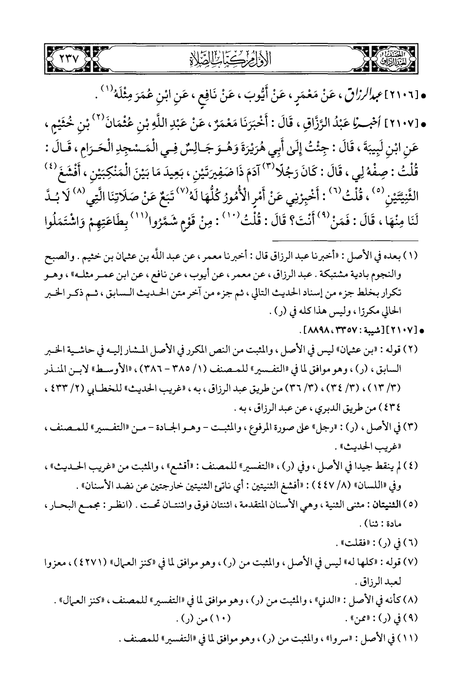 (¬١) بعده في الأصل: "أخبرنا عبد الرزاق قال: أخبرنا معمر، عن عبد الله بن عثمان بن خثيم. والصبح والنجوم بادية مشتبكة. عبد الرزاق، عن معمر، عن أيوب، عن نافع، عن ابن عمر مثله"، وهو تكرار بخلط جزء من إسناد الحديث التالي، ثم جزء من آخر متن الحديث السابق، ثم ذكر الخبر الحالي مكررًا، وليس هذا كله في (ر).