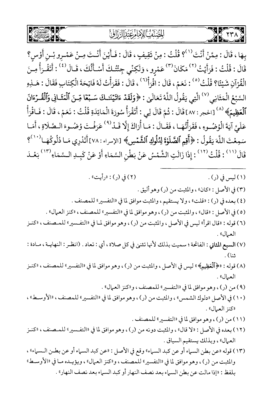 (¬٧) السبع المثاني: الفاتحة؛ سميت بذلك لأنها تثنى في كل صلاة، أي: تعاد. (انظر: النهاية، مادة: ثنا).