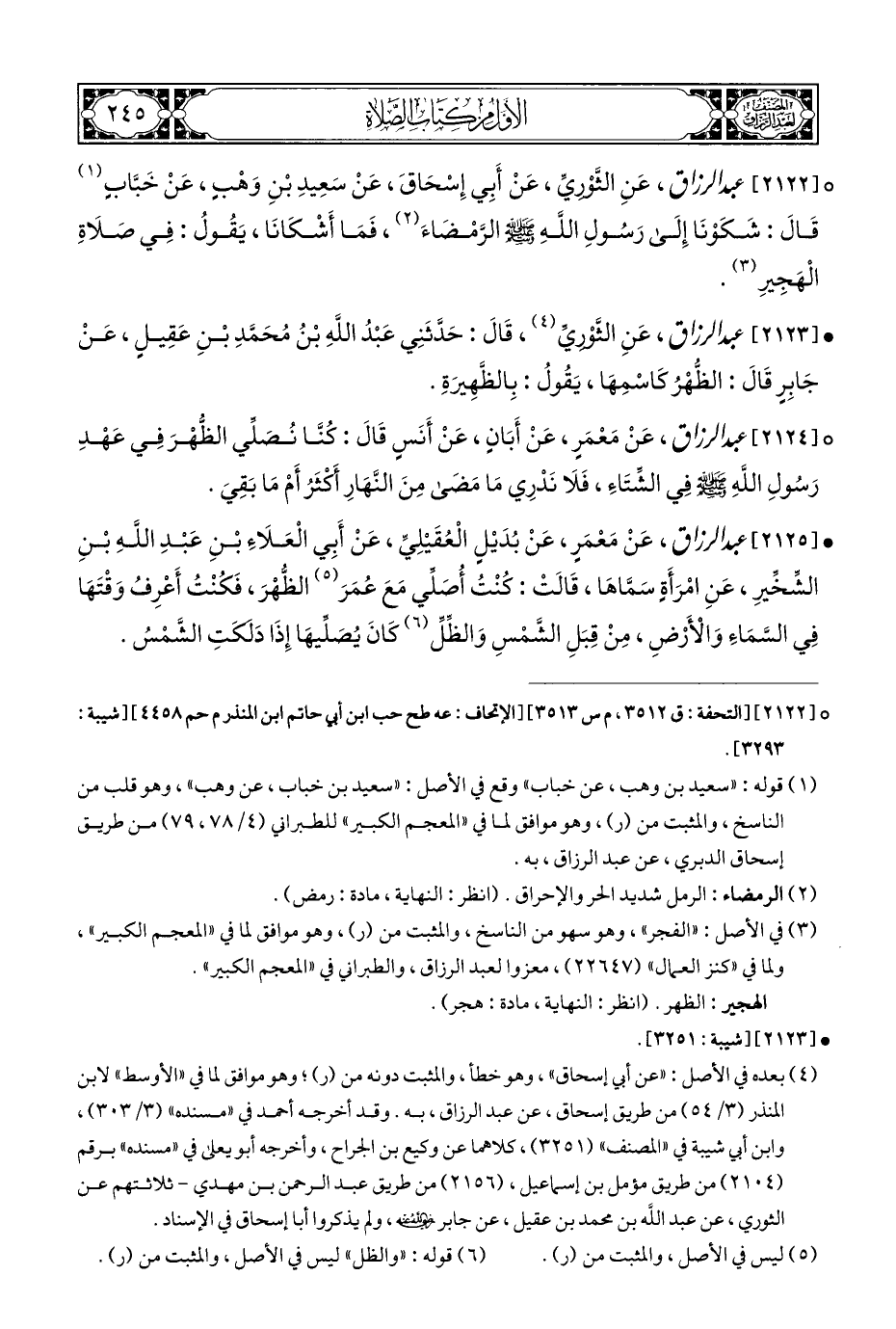 ° [٢١٢٢] عبد الرزاق، عَنِ الثَّوْرِيِّ، عَنْ أَبِي إِسْحَاقَ، عَنْ سَعِيدِ بْنِ وَهْبٍ، عَنْ خَبَّابٍ (¬١) قَالَ: شَكَوْنَا إِلَى رَسُولِ اللَّهِ - صلى الله عليه وسلم - الرَّمْضَاءَ (¬٢)، فَمَا أَشْكَانَا، يَقُولُ: فِي صَلَاةِ الْهَجِيرِ (¬٣).