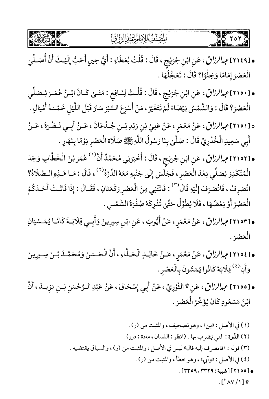 ° [٢١٥١] عبد الرازق، عَنْ مَعْمَرٍ، عَنْ عَلِيِّ بْنِ زَيْدِ بْنِ جُدْعَانَ، عَنْ أَبِي نَضْرَةَ، عَنْ أَبِي سَعِيدٍ الْخُدْرِيِّ قَالَ: صَلَّى بِنَا رَسُولُ اللهِ - صلى الله عليه وسلم - صَلَاةَ الْعَصْرِ يَوْمًا بِنَهَارٍ.