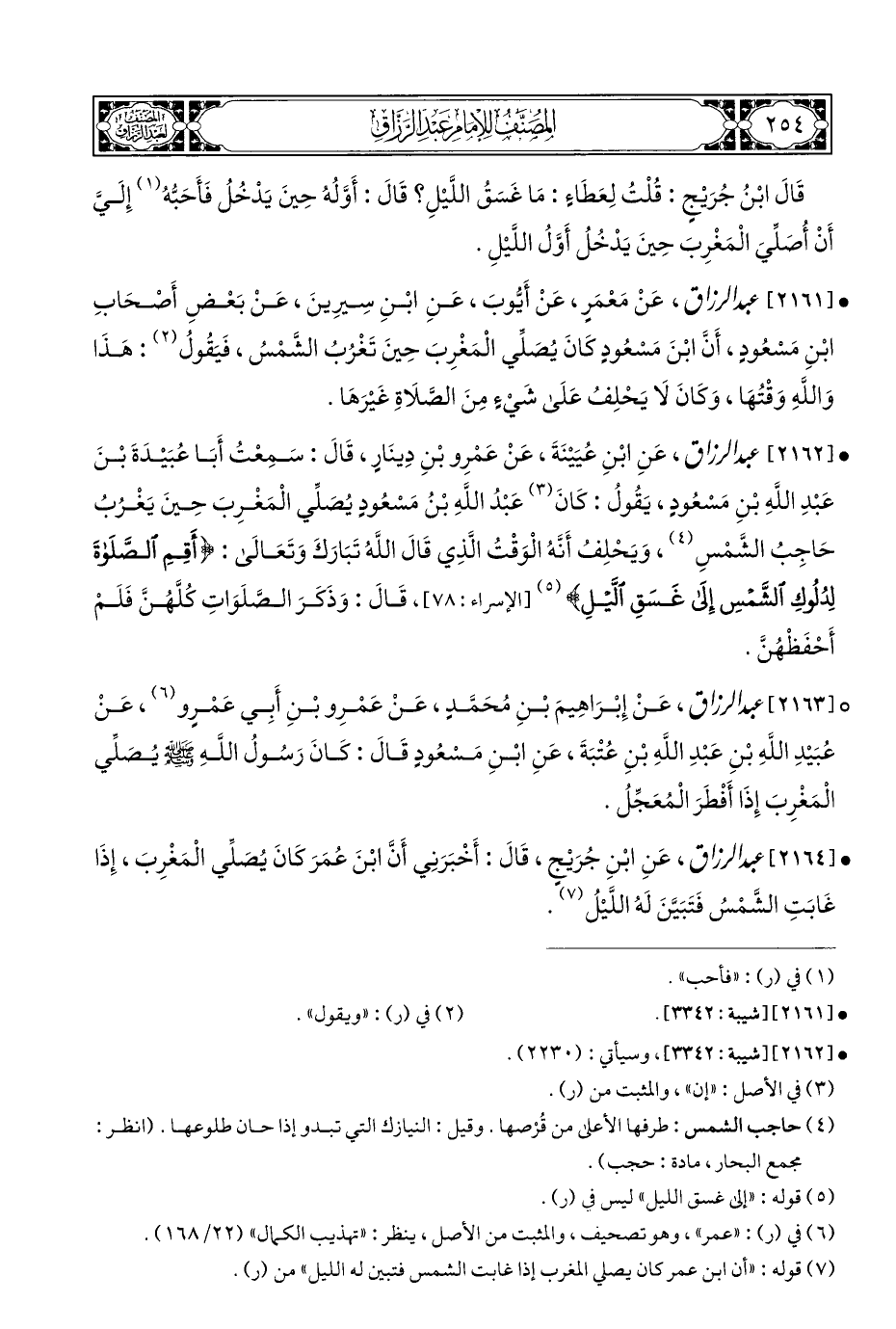 • [٢١٦٤] عبد الرازق، عَنِ ابْنِ جُرَيْجٍ، قَالَ: أَخْبَرَنِي أَنَّ ابْنَ عُمَرَ كَانَ يُصلِّي الْمَغْرِبَ، إِذَا غَابَتِ الشَّمْسُ فَتَبَيَّنَ لَهُ اللَّيْلُ (¬٧).