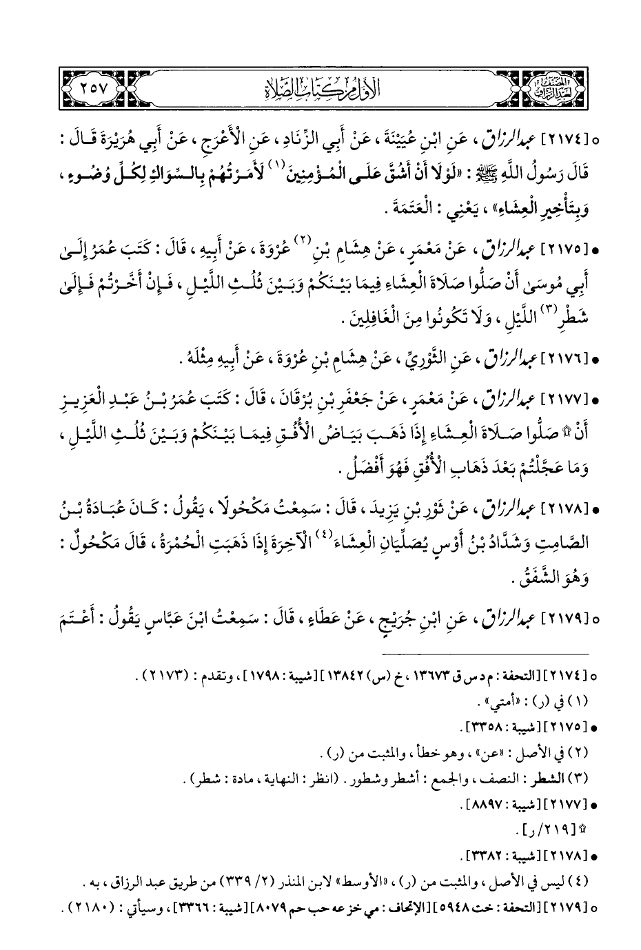 ° [٢١٧٩] عبد الرزاق، عَنِ ابْنِ جُرَيْجٍ، عَنْ عَطَاءٍ، قَالَ: سَمِعْتُ ابْنَ عَبَّاسٍ يَقُولُ: أَعْتَمَ
