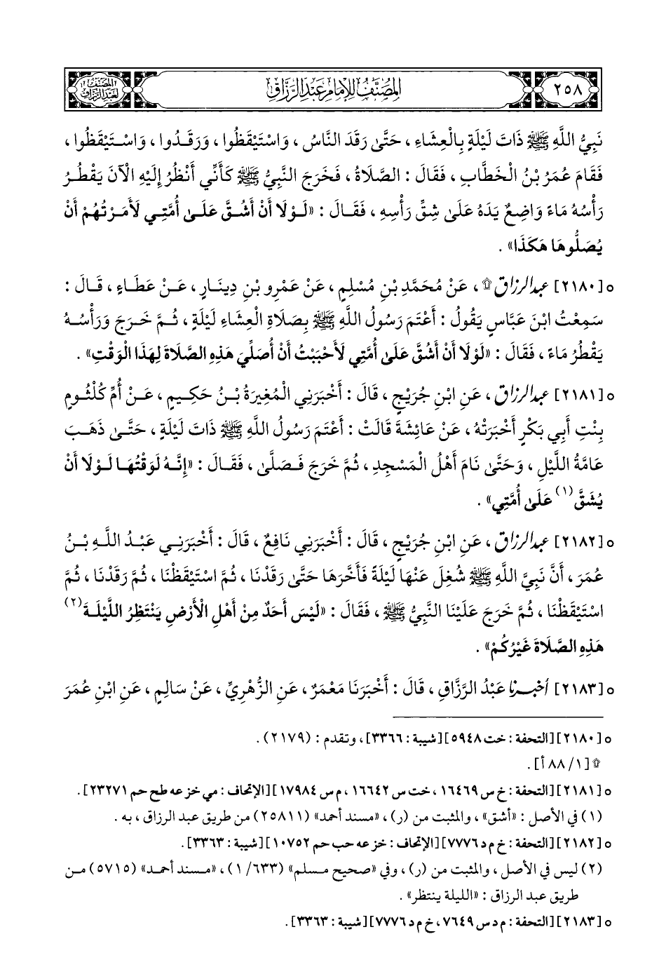° [٢١٨٠] عبد الرزاق *، عَنْ مُحَمَّدِ بْنِ مُسْلِمٍ، عَنْ عَمْرِو بْنِ دِينَارٍ، عَنْ عَطَاءٍ، قَالَ: سَمِعْتُ ابْنَ عَبَّاسٍ يَقُولُ: أَعْتَمَ رَسُولُ اللهِ - صلى الله عليه وسلم - بِصَلَاةِ الْعِشَاءَ لَيْلَةٍ، ثُمَّ خَرَجَ وَرَأْسُهُ يَقْطُرُ مَاءً، فَقَالَ: "لَوْلَا أَنْ أَشُقَّ عَلَى أُمَّتِي لأَحْبَبْتُ أَنْ أُصَلِّيَ هَذِهِ الصَّلَاةَ لِهَذَا الْوَقْتِ".