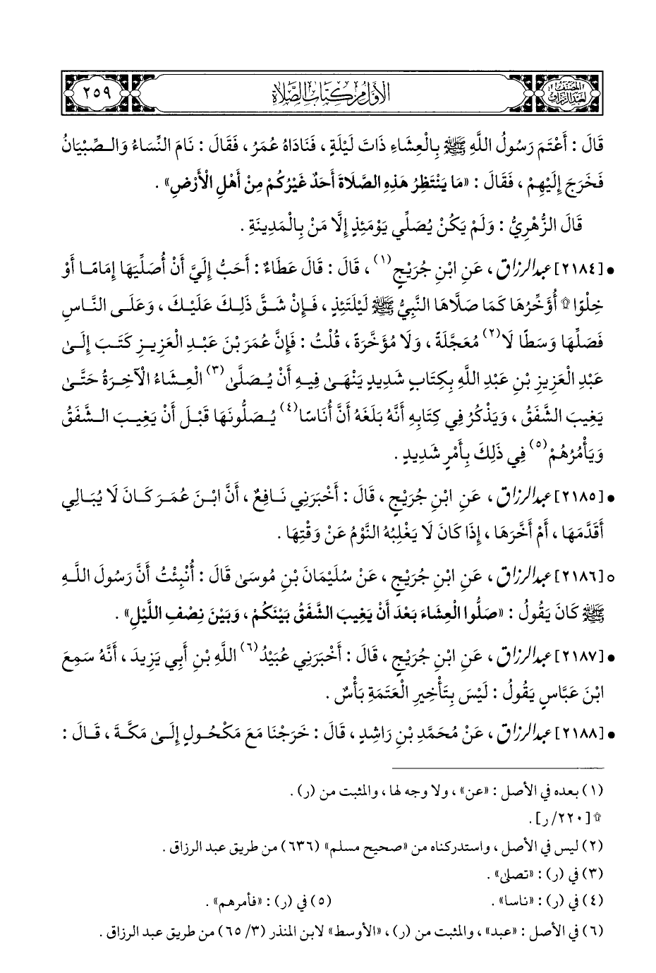 ° [٢١٨٦] عبد الرزاق، عَنِ ابْنِ جُرَيْجٍ، عَنْ سُلَيْمَانَ بْنِ مُوسَى قَالَ: أُنْبِئْتُ أَنَّ رَسُولَ اللهِ - صلى الله عليه وسلم - كَانَ يَقُولُ: "صَلُّوا الْعِشَاءَ بَعْدَ أَنْ يَغِيبَ الشَّفَقُ بَيْنَكُمْ، وَبَيْنَ نِصْفِ اللَّيْلِ".