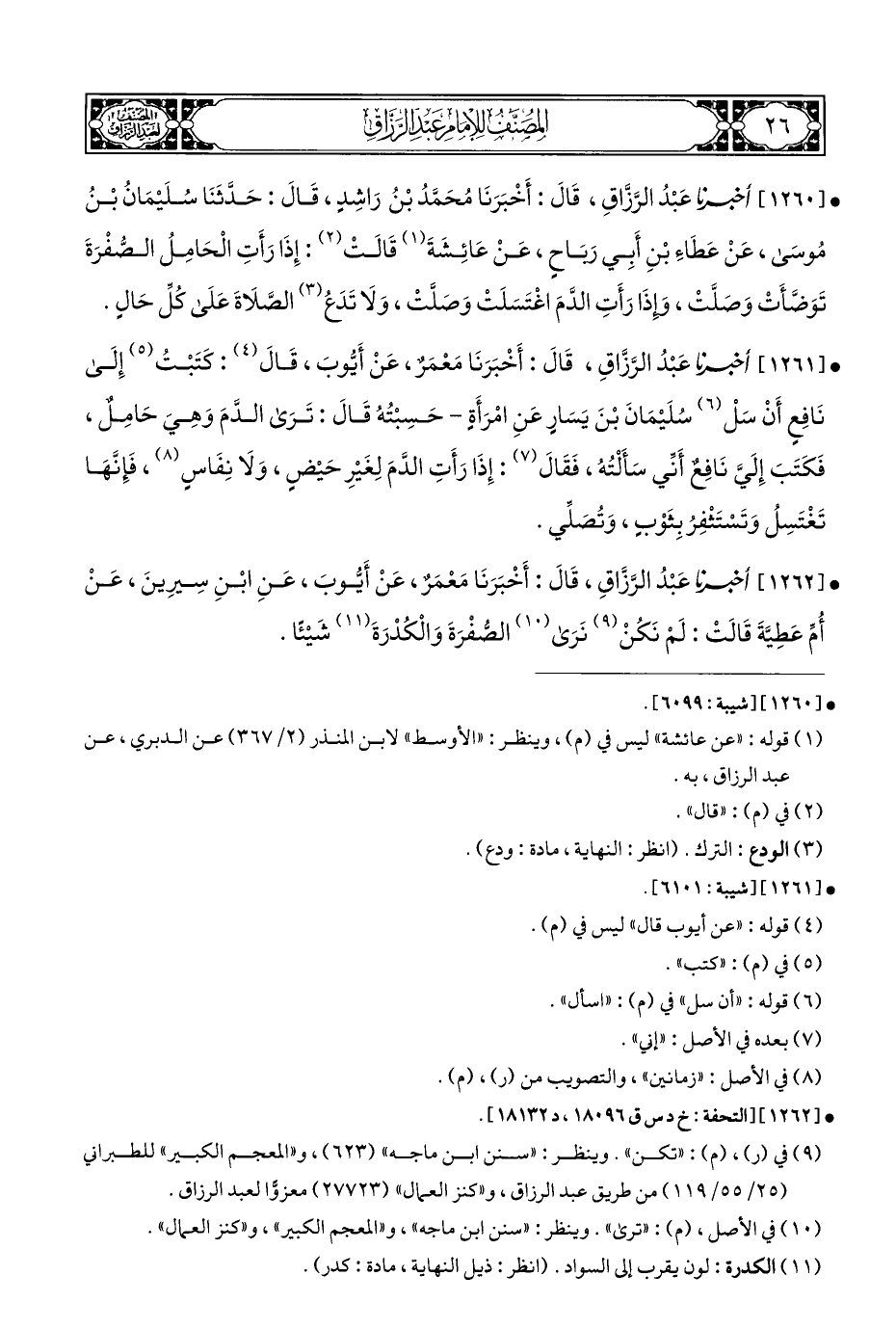 • [١٢٦١] أخبرنا عَبْدُ الرَّزَّاقِ، قَالَ: أَخْبَرَنَا مَعْمَرٌ، عَنْ أَيُّوبَ، قَالَ (¬٤): كَتَبْتُ (¬٥) إِلَى نَافِعٍ أَنْ سَلْ (¬٦) سُلَيْمَانَ بْنَ يَسَارٍ عَنِ امْرَأَةٍ - حَسِبْتُهُ قَالَ: تَرَى الدَّمَ وَهِيَ حَامِلٌ، فَكَتَبَ إِلَيَّ نَافِعٌ أَنِّي سَأَلْتُهُ، فَقَالَ (¬٧): إِذَا رَأَتِ الدَّمَ لِغَيْرِ حَيْضٍ، وَلَا نِفَاسٍ (¬٨)، فَإِنَّهَا تَغْتَسِلُ وَتَسْتَثْفِرُ بِثَوْبٍ، وَتُصَلِّي.