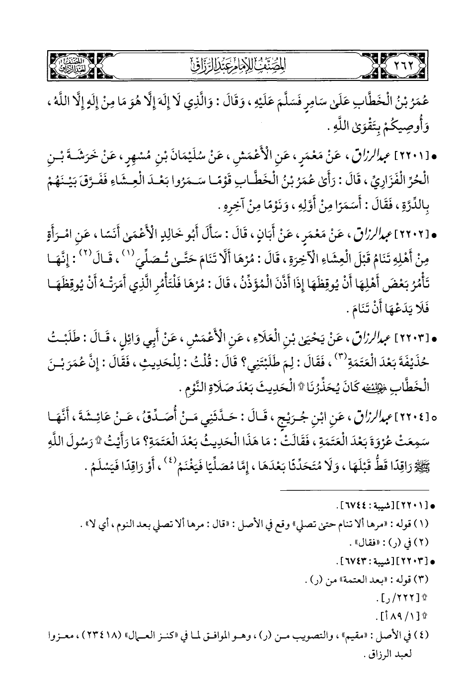 • [٢٢٠٣] عبد الرزاق، عَنْ يَحْيَى بْنِ الْعَلَاءِ، عَنِ الْأَعْمَشِ، عَنْ أَبِي وَائِلٍ، قَالَ: طَلَبْتُ حُذَيْفَةَ بَعْدَ الْعَتَمَةِ (¬٣)، فَقَالَ: لِمَ طَلَبْتَنِي؟ قَالَ: قُلْتُ: لِلْحَدِيثِ، فَقَالَ: إِنَّ عُمَرَ بْنَ الْخَطَّابِ - رضي الله عنه - كَانَ يُحَذِّرُنَا * الْحَدِيثَ بَعْدَ صَلَاةِ النَّوْمِ.