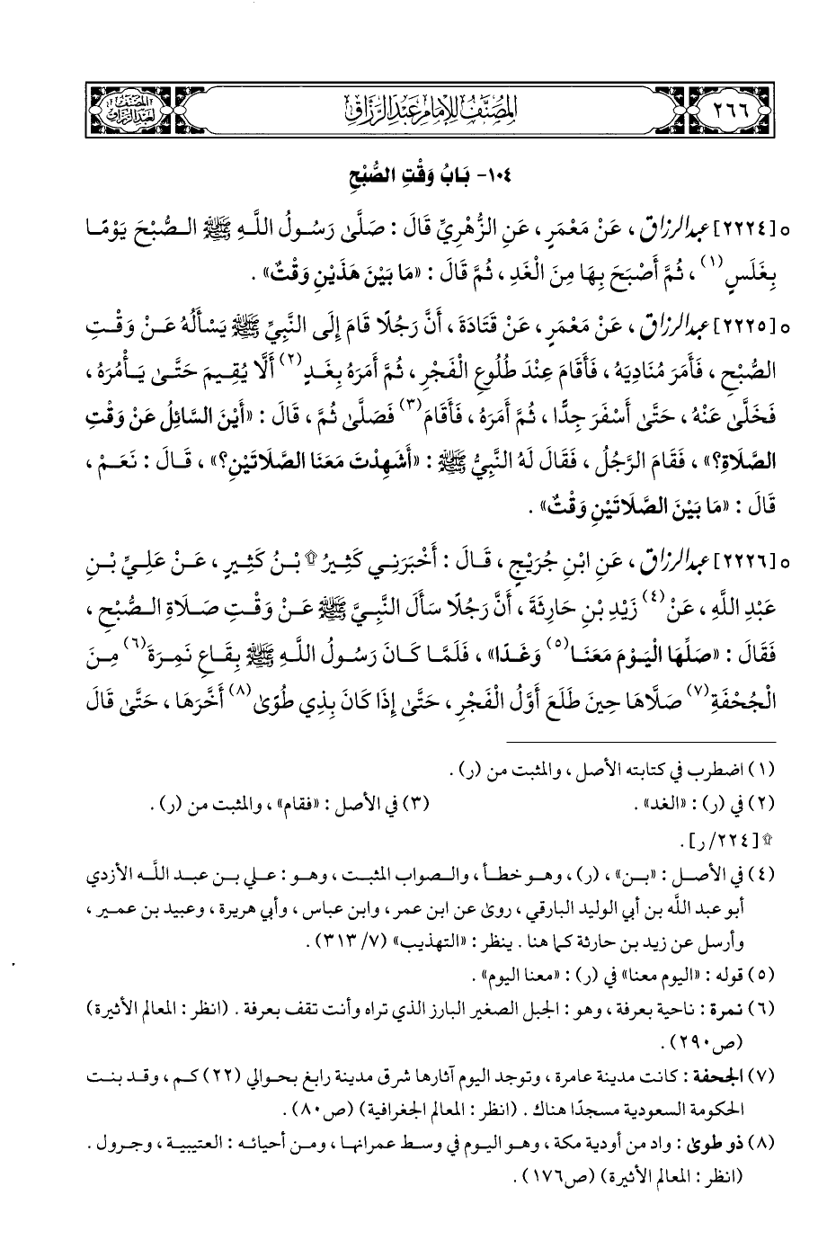 ° [٢٢٢٦] عبد الرزاق، عَنِ ابْنِ جُرَيْجٍ، قَالَ: أَخْبَرَنِي كَثِيرُ * بْنُ كَثِيرٍ، عَنْ عَلِيِّ بْنِ عَبْدِ اللهِ، عَنْ (¬٤) زَيْدِ بْنِ حَارِثَةَ، أَنَّ رَجُلًا سَأَلَ النَّبِيَّ - صلى الله عليه وسلم - عَنْ وَقْتِ صلَاةِ الصُّبْحِ، فَقَالَ: "صَلِّهَا الْيَوْمَ مَعَنَا (¬٥) وَغَدًا"، فَلَمَّا كَانَ رَسُولُ اللهِ - صلى الله عليه وسلم - بِقَاعِ نَمِرَةَ (¬٦) مِنَ الْجُحْفَةِ (¬٧) صَلَّاهَا حِينَ طَلَعَ أَوَّلُ الْفَجْرِ، حَتَّى إِذَا كَانَ بِذِي طُوَى (¬٨) أَخَّرَهَا، حَتَّى قَالَ