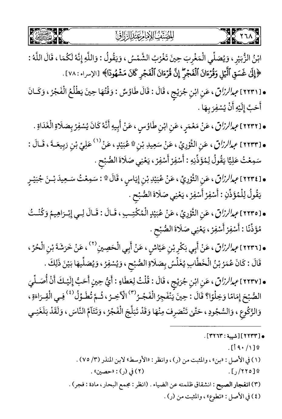 • [٢٢٣٣] عبد الرزاق، عَنِ الثَّوْرِيِّ، عَنْ سَعِيدِ بْنِ * عُبَيْدِ، عَنْ (¬١) عَلِيِّ بْنِ رَبِيعَةَ، قَالَ: سَمِعْتُ عَلِيًّا يَقُولُ لِمُؤَذِّنِهِ: أَسْفِرْ أَسْفِرْ، يَعْنِي صلَاةَ الصُّبْحِ.