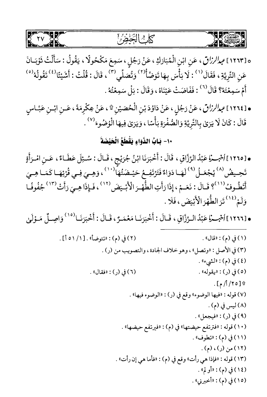 • [١٢٦٥] أخبرنا عَبْدُ الرَّزَّاقِ، قَالَ: أَخْبَرَنَا ابْنُ جُرَيْجٍ، قَالَ: سُئِلَ عَطَاءٌ، عَنِ امْرَأَةٍ تَحِيضُ (¬٨) يُجْعَلُ (¬٩) لَهَا دَوَاءٌ فَتَرْتَفِعُ حَيْضَتُهَا (¬١٠)، وَهِيَ فِي قُرْئِهَا كَمَا هِيَ أَتَطُوفُ (¬١١)؟ قَالَ: نَعَمْ، إِذَا رَأَتِ الطُّهْرَ الْأَبْيَضَ (¬١٢)، فَإِذَا هِيَ رَأَتْ (¬١٣) جُفُوفًا وَلَمْ (¬١٤) تَرَ الطُّهْرَ الْأَبْيَضَ، فَلَا.