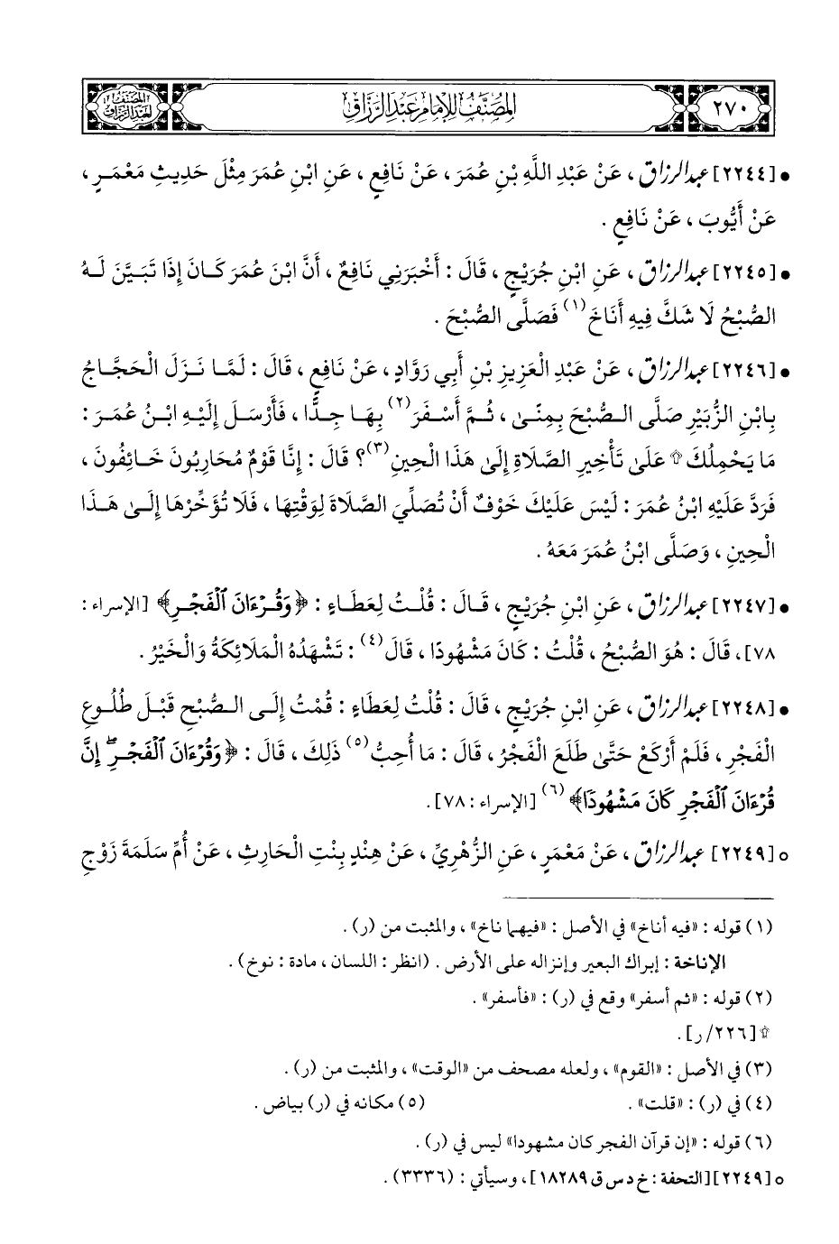 • [٢٢٤٧] عبد الرزاق، عَنِ ابْنِ جُرَيْجٍ، قَالَ: قُلْتُ لِعَطَاءٍ: {وَقُرْآنَ الْفَجْرِ} [الإسراء: ٧٨]، قَالَ: هُوَ الصُّبْحُ، قُلْتُ: كَانَ مَشْهُودًا، قَالَ (¬٤): تَشْهَدُهُ الْمَلَائِكَةُ وَالْخَيْرُ.