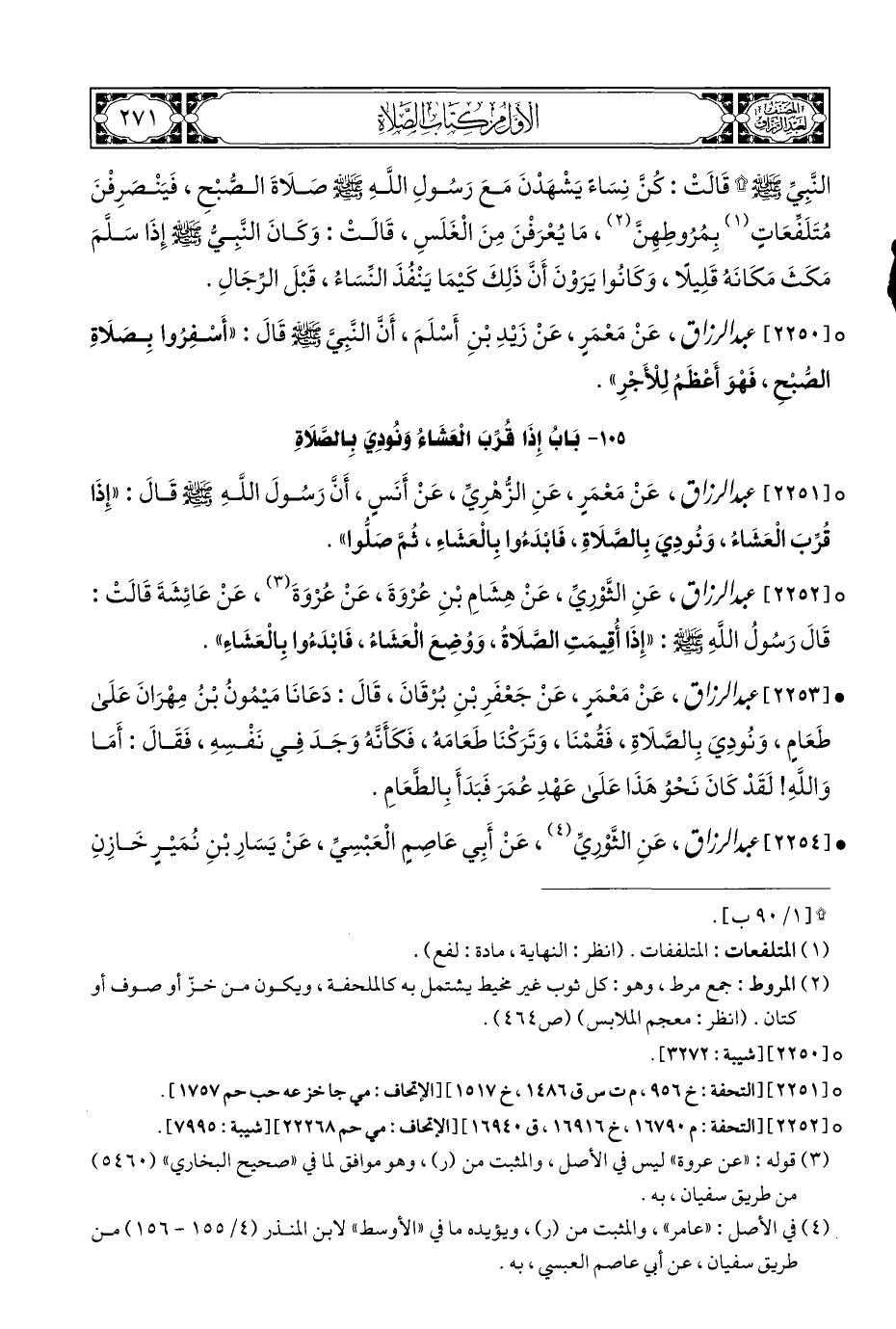 ° [٢٢٥٠] عبد الرزاق، عَنْ مَعْمَرٍ، عَنْ زَيْدِ بْنِ أَسْلَمَ، أَنَّ النَّبِيَّ - صلى الله عليه وسلم - قَالَ: "أَسْفِرُوا بِصَلَاةِ الصُّبْحِ، فَهْوَ أَعْظَمُ لِلْأَجْرِ".