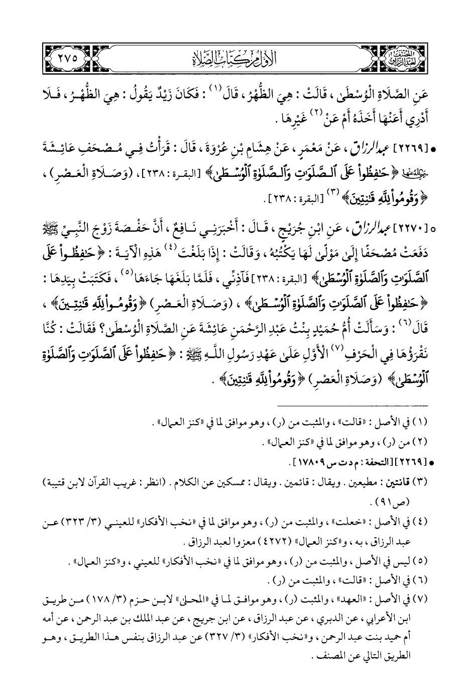 ° [٢٢٧٠] عبد الرزاق، عَنِ ابنِ جُرَيْجٍ، قَالَ: أَخْبَرَنِي نَافِعٌ، أَنَّ حَفْصَةَ زَوْجَ النَّبِيِّ - صلى الله عليه وسلم - دَفَعَتْ مُصْحَفًا إِلَى مَوْلَى لَهَا يَكْتُبُهُ، وَقَالَتْ: إِذَا بَلَغْتَ (¬٤) هَذِهِ الْآيَةَ: {حَافِظُوا عَلَى الصَّلَوَاتِ وَالصَّلَاةِ الْوُسْطَى} [البقرة: ٢٣٨] فَآذِنِّي، فَلَمَّا بَلَغَهَا جَاءَهَا (¬٥)، فَكَتَبَتْ بِيَدِهَا: {حَافِظُوا عَلَى الصَّلَوَاتِ وَالصَّلَاةِ الْوُسْطَى}، (وَصلَاةِ الْعَصرِ) {وَقُومُوا لِلَّهِ قَانِتِينَ}، قَالَ (¬٦): وَسَأَلَتْ أُمُّ حُمَيْدٍ بِنْتُ عَبْدِ الرَّحْمَنِ عَائِشَةَ عَنِ الصَّلَاةِ الْوُسْطَى؟ فَقَالَتْ: كُنَّا نَقْرَؤُهَا فِي الْحَرْفِ (¬٧) الْأَوَّلِ عَلَى عَهْدِ رَسُولِ اللهِ - صلى الله عليه وسلم -: {حَافِظُوا عَلَى الصَّلَوَاتِ وَالصَّلَاةِ الْوُسْطَى} (وَصَلَاةِ الْعَصْرِ) {وَقُومُوا لِلَّهِ قَانِتِينَ}.