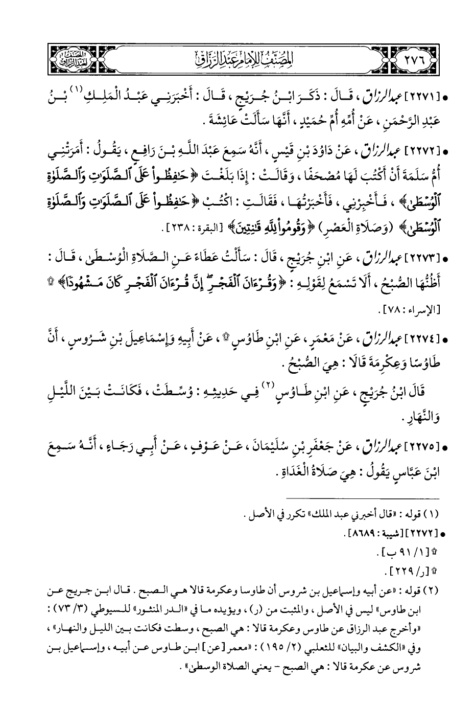 • [٢٢٧٢] عبد الرزاق، عَنْ دَاوُدَ بْنِ قَيْسٍ، أَنَّهُ سَمِعَ عَبْدَ اللهِ بْنَ رَافِعٍ، يَقُولُ: أَمَرَتْنِي أُمُّ سَلَمَةَ أَنْ أكتُبَ لَهَا مُصْحَفًا، وَقَالَتْ: إِذَا بَلَغْتَ {حَافِظُوا عَلَى الصَّلَوَاتِ وَالصَّلَاةِ الْوُسْطَى}، فَأَخْبِرْنِي، فَأَخْبَرْتُهَا، فَقَالَتِ: اكْتُبْ {حَافِظُوا عَلَى الصَّلَوَاتِ وَالصَّلَاةِ الْوُسْطَى} (وَصَلَاةِ الْعَصرِ) {وَقُومُوا لِلَّهِ قَانِتِينَ} [البقرة: ٢٣٨].