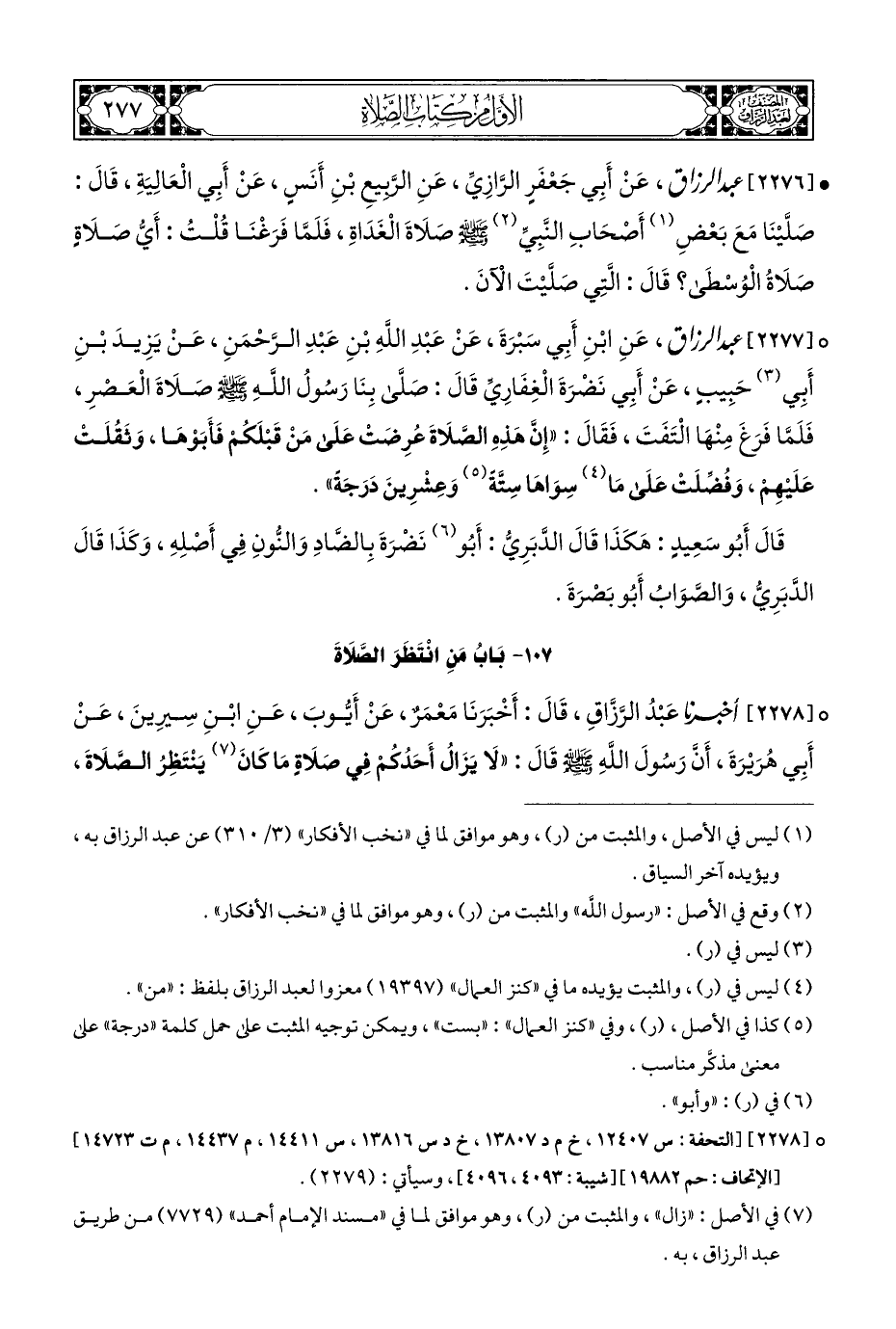 ° [٢٢٧٨] أخبرنا عَبْدُ الرَّزَّاقِ، قَالَ: أَخْبَرَنَا مَعْمَرٌ، عَنْ أَيُّوبَ، عَنِ ابْنِ سِيرِينَ، عَنْ أَبِي هُرَيْرَةَ، أَنَّ رَسُولَ اللهِ - صلى الله عليه وسلم - قَالَ: "لَا يَزَالُ أَحَدُكُمْ فِي صَلَاةٍ مَا كَانَ (¬٧) يَنْتَظِرُ الصَّلَاةَ،