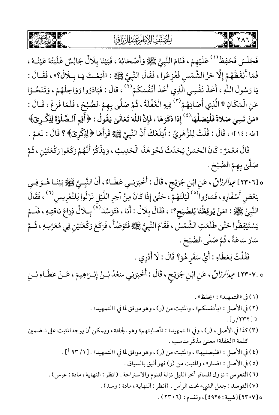 ° [٢٣٠٦] عبد الرزاق، عَنِ ابْنِ جُرَيْجٍ، قَالَ: أَخْبَرَنِي عَطَاءٌ، أَنَّ النَّبِيَّ - صلى الله عليه وسلم - بَيْنَا هُوَ فِي بَعْضِ أَسْفَارِهِ، فَسَارُوا (¬٥) لَيْلَتَهُمْ، حَتَّى إِذَا كَانَ مِنْ آخِرِ اللَّيْلِ نَزَلُوا لِلتَّعْرِيسِ (¬٦)، فَقَالَ النَّبِيُّ - صلى الله عليه وسلم -: "مَنْ يُوقِظُنَا لِلصُّبْحِ؟ "، فَقَالَ بِلَالٌ: أَنَا، فَتَوَسَّدَ (¬٧) بِلَالٌ ذِرَاعَ نَاقَتِهِ، فَلَمْ يَسْتَيْقِظُوا حَتَّى طَلَعَتِ الشَّمْسُ، فَقَامَ النَّبِيُّ - صلى الله عليه وسلم - فَتَوَضَّأَ، فَرَكَعَ رَكْعَتَيْنِ فِي مُعَرَّسِهِ، ثُمَّ سَارَ سَاعَةً، ثُمَّ صَلَّى الصُّبْحَ.