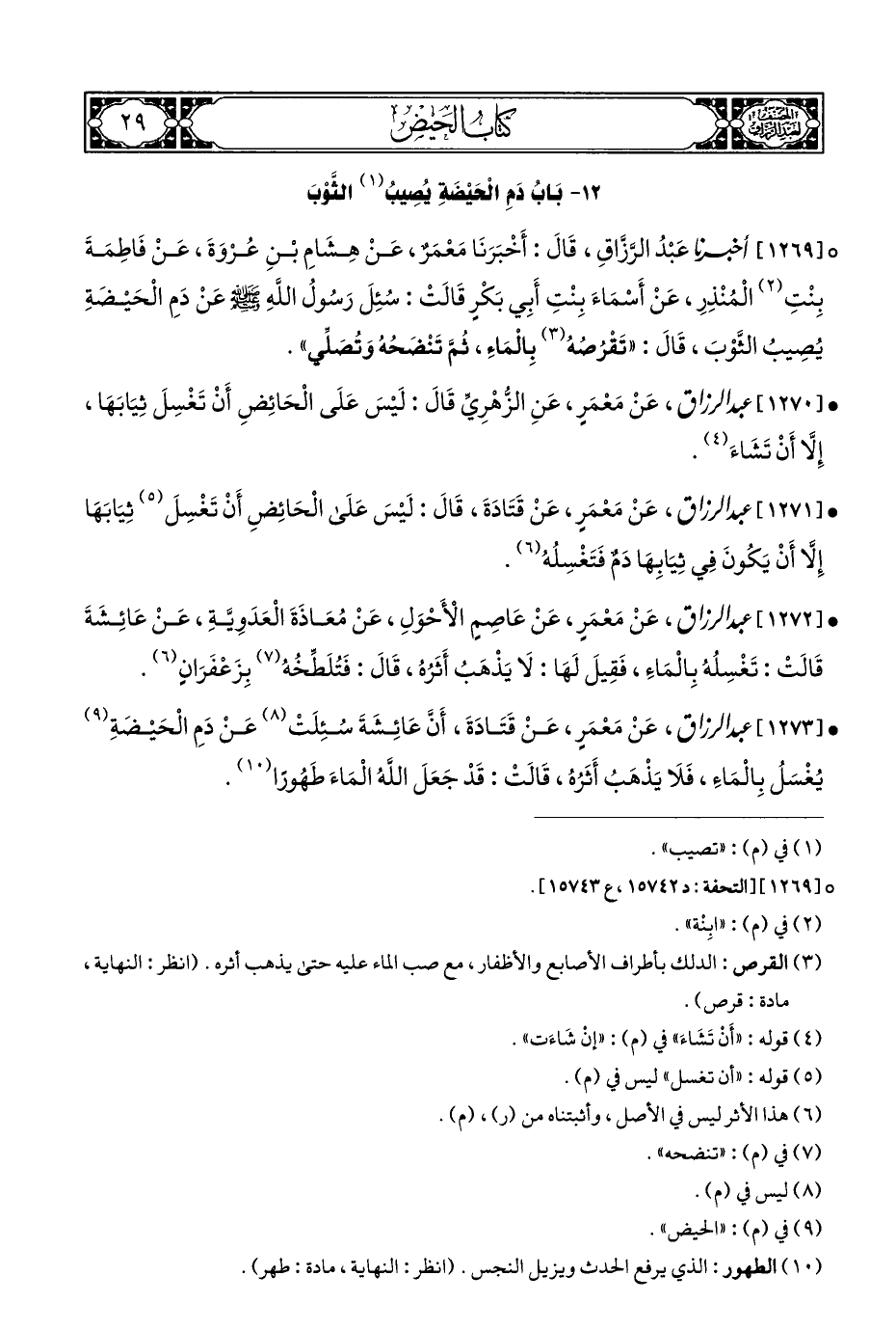 • [١٢٧٠] عبد الرزاق، عَنْ مَعْمَرٍ، عَنِ الزُّهْرِيِّ قَالَ: لَيْسَ عَلَى الْحَائِضِ أَنْ تَغْسِلَ ثِيَابَهَا، إِلَّا أَنْ تَشَاءَ (¬٤).