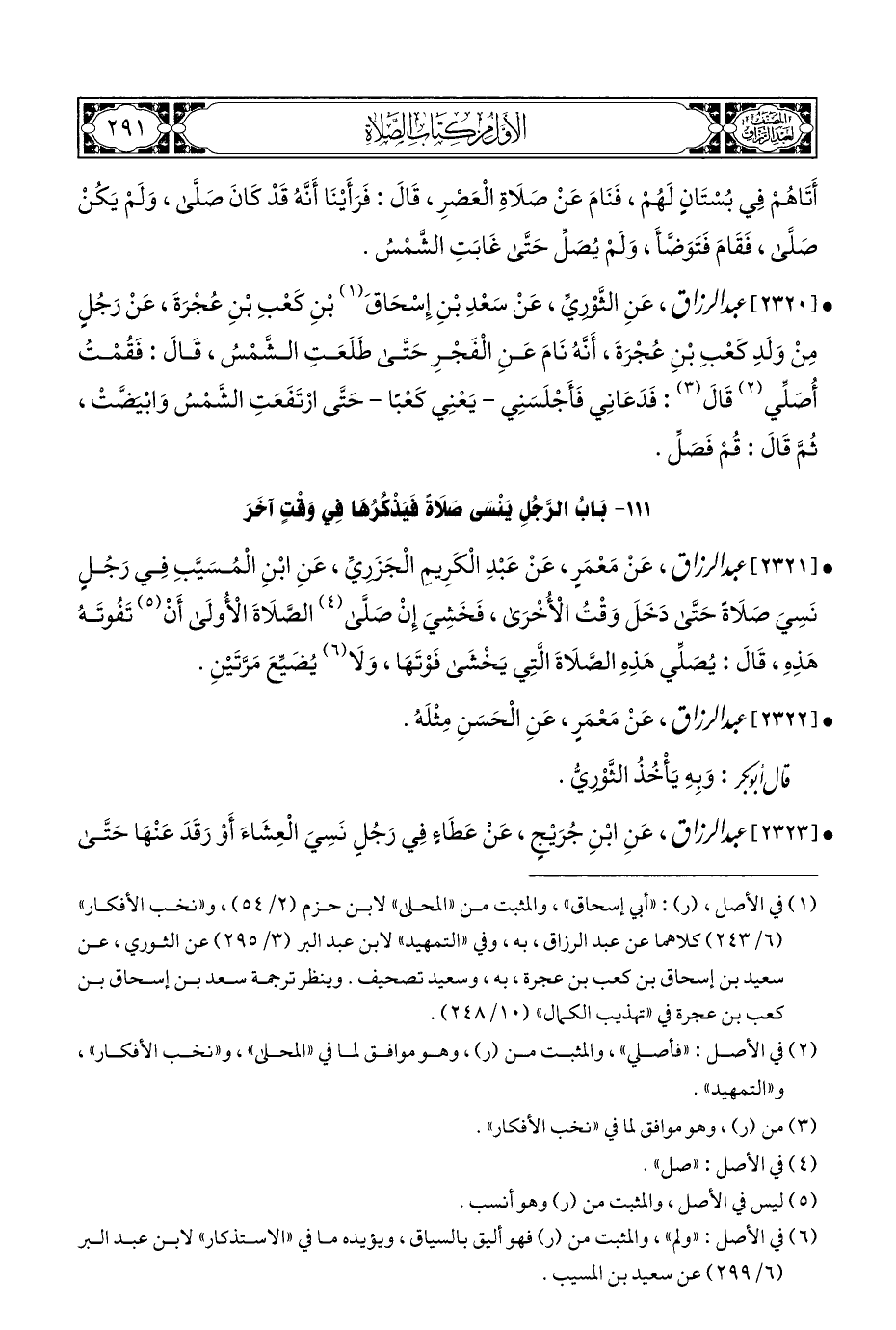 • [٢٣٢١] عبد الرزاق، عَنْ مَعْمَرٍ، عَنْ عَبْدِ الْكَرِيمِ الْجَزَرِيِّ، عَنِ ابْنِ الْمُسَيَّبِ فِي رَجُلٍ نَسِيَ صَلَاةً حَتَّى دَخَلَ وَقْتُ الْأُخْرَى، فَخَشِيَ إِنْ صَلَّى (¬٤) الصَّلَاةَ الْأُولَى أَنْ (¬٥) تَفُوتَهُ هَذِهِ، قَالَ: يُصَلِّي هَذِهِ الصَّلَاةَ الَّتِي يَخْشَى فَوْتَهَا، وَلَا (¬٦) يُضَيِّعَ مَرَّتَيْنِ.