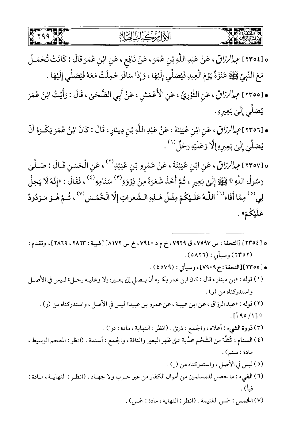 ° [٢٣٥٧] عبد الرزاق، عَنِ ابْنِ عُيَيْنَةَ، عَنْ عَمْرِو بْنِ عُبَيْدٍ (¬٢)، عَنِ الْحَسَنِ قَالَ: صَلَّى رَسُولُ اللَّهِ * - صلى الله عليه وسلم - إِلَى بَعِيرٍ، ثُمَّ أَخَذَ شَعَرَةً مِنْ ذِرْوَةِ (¬٣) سَنَامِهِ (¬٤)، فَقَالَ: "إِنَّهُ لَا يَحِلُّ لِي (¬٥) مِمَّا أَفَاءَ (¬٦) اللَّهُ عَلَيْكُمْ مِثْلُ هَذِهِ الشَّعَرَاتِ إِلَّا الْخُمُسَ (¬٧)، ثُمَّ هُوَ مَرْدُودٌ عَلَيْكُمْ".