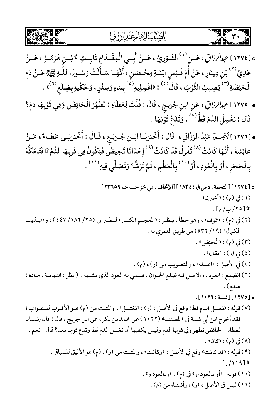 (¬٧) قوله: "تغسل الدم قط" وقع في الأصل، (ر): "تغتسل"، والمثبت من (م) هو الأقرب للصواب؛ فقد أخرج ابن أبي شيبة في "المصنف" (١٠٢٢) عن محمد بن بكر، عن ابن جريج، قال: قال إنسان لعطاء: الحائض تطهر وفي ثوبها الدم وليس يكفيها أن تغسل الدم قط وتدع ثوبها بعد؟ قال: نعم.
