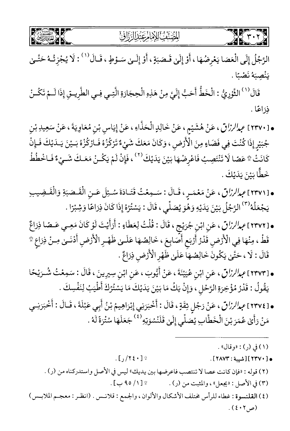 • [٢٣٧٤] عبد الرزاق، عَنْ رَجُلٍ ثِقَةٍ، قَالَ: أَخْبَرَنِي إِبْرَاهِيمُ بْنُ أَبِي عَبْلَةَ، قَالَ: أَخْبَرَنِي مَنْ رَأَى عُمَرَ بْنَ الْخَطَّابِ يُصَلِّي إِلَى قَلَنْسُوَتِهِ (¬٤) جَعَلَهَا سُتْرةً لَهُ.