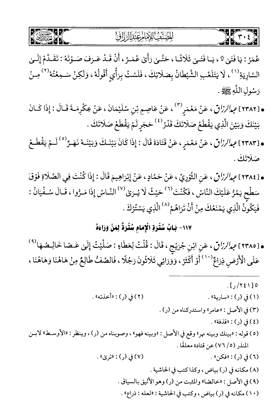 • [٢٣٨٤] عبد الرزاق، عَنِ الثَّوْري، عَنْ حَمَّادٍ، عَنْ إِبْرَاهِيمَ قَالَ: إِذَا كُنْتَ فِي الصَّلَاةِ فَوْقَ سَطْحٍ يَمُرُّ عَلَيْكَ النَّاسُ، فَكُنْتَ (¬٦) حَيْثُ لَا يُرَى (¬٧) النَّاسُ إِذَا مَرُّوا، قَالَ سُفْيَانُ: فَيَكُونُ الَّذِي يَمْنَعُكَ مِنْ أَنْ تَرَاهُمُ (¬٨) الَّذِي يَسْتُرُكَ.