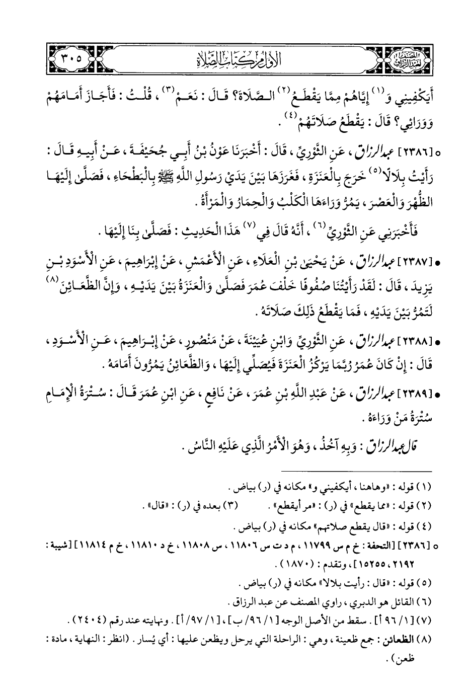 ° [٢٣٨٦] عبد الرزاق، عَنِ الثَّوْرِيِّ، قَالَ: أَخْبَرَنَا عَوْنُ بْنُ أَبِي جُحَيْفَةَ، عَنْ أَبِيهِ قَالَ: رَأَيْتُ بِلَالًا (¬٥) خَرَجَ بِالْعَنَزَةِ، فَغَرَزَهَا بَيْنَ يَدَيْ رَسُولِ اللَّهِ - صلى الله عليه وسلم - بِالْبَطْحَاءِ، فَصَلَّى إِلَيْهَا الظُّهْرَ وَالْعَصْرَ، يَمُرُّ وَرَاءَهَا الْكَلْبُ وَالْحِمَارُ وَالْمَرْأَةُ.