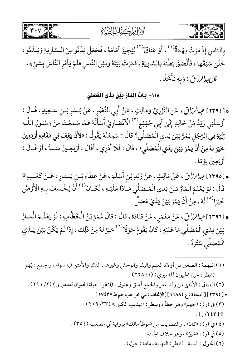 ° [٢٣٩٤] عبد الرزاق، عَنِ الثَّوْرِيِّ وَمَالِكٍ، عَنْ أَبِي النَّضْرِ، عَنْ بُسْرِ بْنِ سَعِيدٍ، قَالَ: أَرْسَلَنِي زَيْدُ بْنُ خَالِدٍ إِلَى أَبِي جُهَيْمٍ (¬٣) الْأَنْصَارِيِّ أَسْأَلُهُ عَمَّا سَمِعْتَ مِنْ رَسُولِ اللَّهِ - صلى الله عليه وسلم - في الرَّجُلِ يَمُرُّ بَيْنَ يَدَيِ الْمُصَلِّي؟ قَالَ: سَمِعْتُهُ يَقُولُ: "لأَنْ يَقِفَ فِي مَقَامِهِ أَرْبَعِينَ خَيْرٌ لَهُ مِنْ أَنْ يَمُرَّ بَيْنَ يَدَيِ الْمُصَلِّي"، قَالَ: فَلَا أَدْرِي، أَقَالَ: أَرْبَعِينَ سَنَةً، أَوْ قَالَ: أَرْبَعِينَ يَوْمًا.