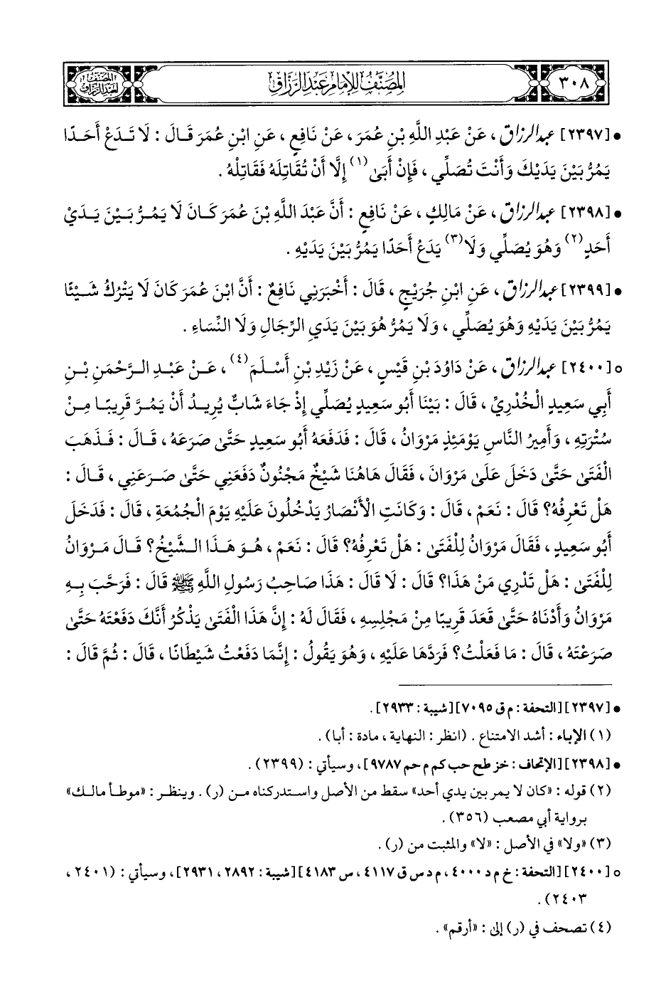 ° [٢٤٠٠] عبد الرزاق، عَنْ دَاوُدَ بْنِ قَيْسٍ، عَنْ زَيْدِ بْنِ أَسْلَمَ (¬٤)، عَنْ عَبْدِ الرَّحْمَنِ بْنِ أَبِي سَعِيدٍ الْخُدْرِيِّ، قَالَ: بَيْنَا أَبُو سَعِيدٍ يُصَلِّي إِذْ جَاءَ شَابٌّ يُرِيدُ أَنْ يَمُرَّ قَرِيبًا مِنْ سُتْرَتِهِ، وَأَمِيرُ النَّاسِ يَوْمَئِذٍ مَرْوَانُ، قَالَ: فَدَفَعَهُ أَبُو سَعِيدٍ حَتَّى صَرَعَهُ، قَالَ: فَذَهَبَ الْفَتَى حَتَّى دَخَلَ عَلَى مَرْوَانَ، فَقَالَ هَاهُنَا شَيْخ مَجْنُونٌ دَفَعَنِي حَتَّى صرَعَنِي، قَالَ: هَلْ تَعْرِفُهُ؟ قَالَ: نَعَمْ، قَالَ: وَكَانَتِ الْأَنْصارُ يَدْخُلُونَ عَلَيْهِ يَوْمَ الْجُمُعَةِ، قَالَ: فَدَخَلَ أَبُو سَعِيدٍ، فَقَالَ مَرْوَانُ لِلْفَتَى: هَلْ تَعْرِفُهُ؟ قَالَ: نَعَمْ، هُوَ هَذَا الشَّيْخُ؟ قَالَ مَرْوَانُ لِلْفَتَى: هَلْ تَدْرِي مَنْ هَذَا؟ قَالَ: لَا قَالَ: هَذَا صَاحِبُ رَسُولِ اللَّهِ - صلى الله عليه وسلم - قَالَ: فَرَحَّبَ بِهِ مَرْوَانُ وَأَدْنَاهُ حَتَّى قَعَدَ قَرِيبًا مِنْ مَجْلِسِهِ، فَقَالَ لَهُ: إِنَّ هَذَا الْفَتَى يَذْكُرُ أَنَّكَ دَفَعْتَهُ حَتَّى صَرَعْتَهُ، قَالَ: مَا فَعَلْتُ؟ فَرَدَّهَا عَلَيْهِ، وَهُوَ يَقُولُ: إِنَّمَا دَفَعْتُ شَيْطَانًا، قَالَ: ثُمُّ قَالَ: