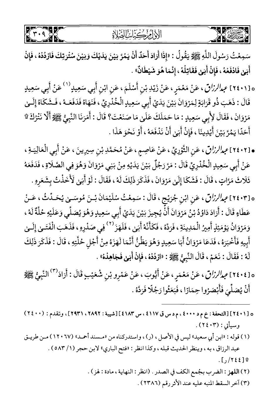 ° [٢٤٠٣] عبد الرزاق، عَنِ ابْنِ جُرَيْجٍ، قَالَ: سَمِعْتُ سُلَيْمَانَ بْنَ مُوسَى يُحَدِّثُ، عَنْ عَطَاءٍ قَالَ: أَرَادَ دَاوُدُ بْنُ مَرْوَانَ أَنْ يُجِيزَ بَيْنَ يَدَيْ أَبِي سَعِيدٍ وَهُوَ يُصَلِّي وَعَلَيْهِ حُلَّةٌ لَهُ، وَمَرْوَانُ يَوْمَئِذٍ أَمِيرُ الْمَدِينَةِ، فَرَدَّهُ، فَكَأَنَّهُ أَبَى، فَلَهَزَ (¬٢) فِي صَدْرِهِ، فَذَهَبَ الْفَتَى إِلَى أَبِيهِ فَأَخْبَرَهُ، فَدَعَا مَرْوَانُ أَبَا سَعِيدٍ وَهُوَ يَظُنُّ أَنَّمَا لَهَزَهُ مِنْ أَجْلِ حُلَّتِهِ، قَالَ: فَذَكَرَ ذَلِكَ لَهُ: فَقَالَ: نَعَمْ، قَالَ النَّبِيُّ - صلى الله عليه وسلم -: "ارْدُدْهُ، فَإِنْ أَبَى فَجَاهِدْهُ".