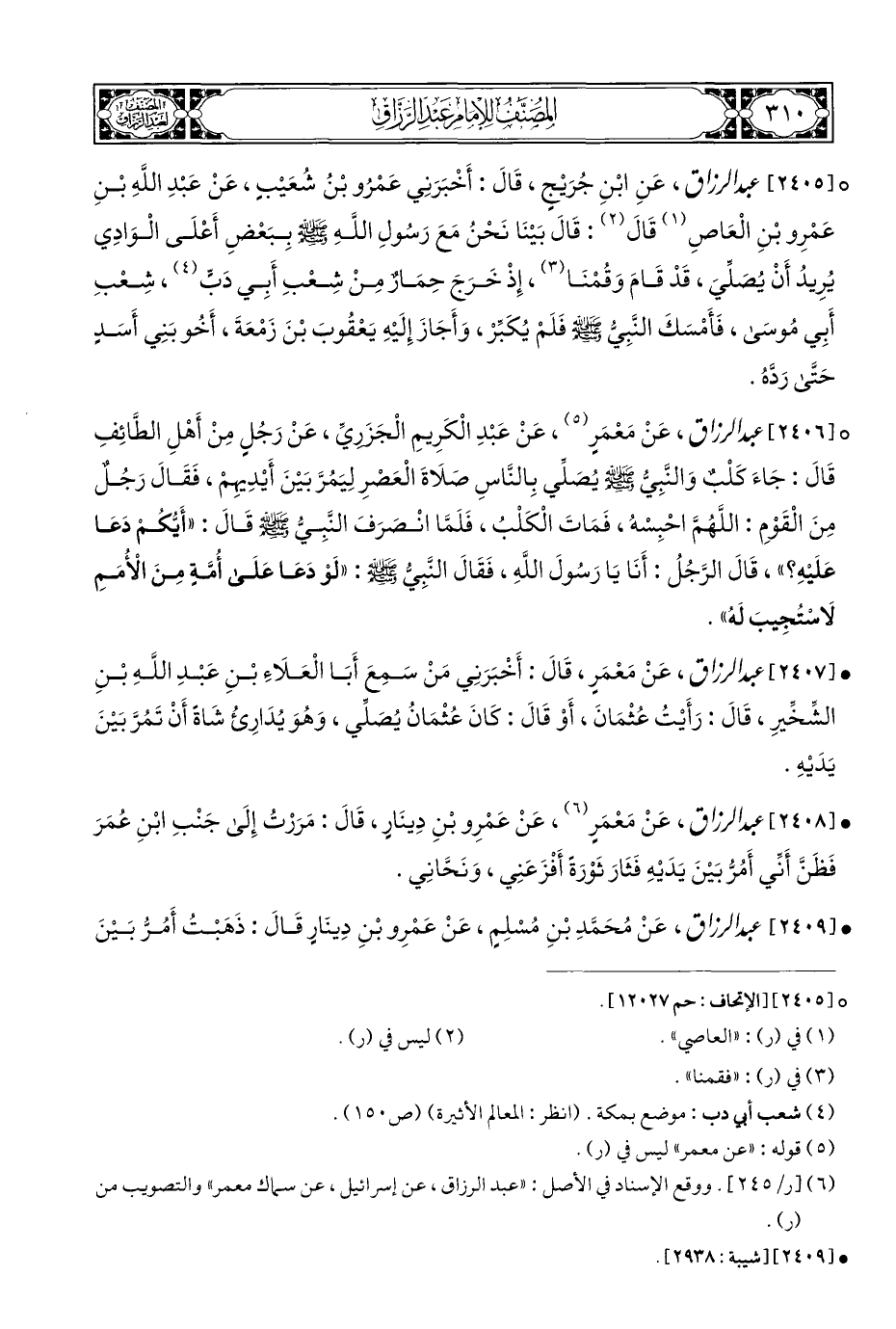° [٢٤٠٥] عبد الرزاق، عَنِ ابْنِ جُرَيْجٍ، قَالَ: أَخْبَرَنِي عَمْرُو بْنُ شُعَيْبٍ، عَنْ عَبْدِ اللَّهِ بْنِ عَمْرِو بْنِ الْعَاصِ (¬١) قَالَ (¬٢): قَالَ بَيْنَا نَحْنُ مَعَ رَسُولِ اللَّهِ - صلى الله عليه وسلم - بِبَعْضِ أَعْلَى الْوَادِي يُرِيدُ أَنْ يُصلِّيَ، قَدْ قَامَ وَقُمْنا (¬٣)، إِذْ خَرَجَ حِمَارٌ مِنْ شِعْبِ أَبِي دَبٍّ (¬٤)، شِعْبِ أَبِي مُوسَى، فَأَمْسَكَ النَّبِيُّ - صلى الله عليه وسلم - فَلَمْ يُكَبِّرْ، وَأَجَازَ إِلَيْهِ يَعْقُوبَ بْنَ زَمْعَةَ، أَخو بَنِي أَسَدٍ حَتَى رَدَّهُ.
