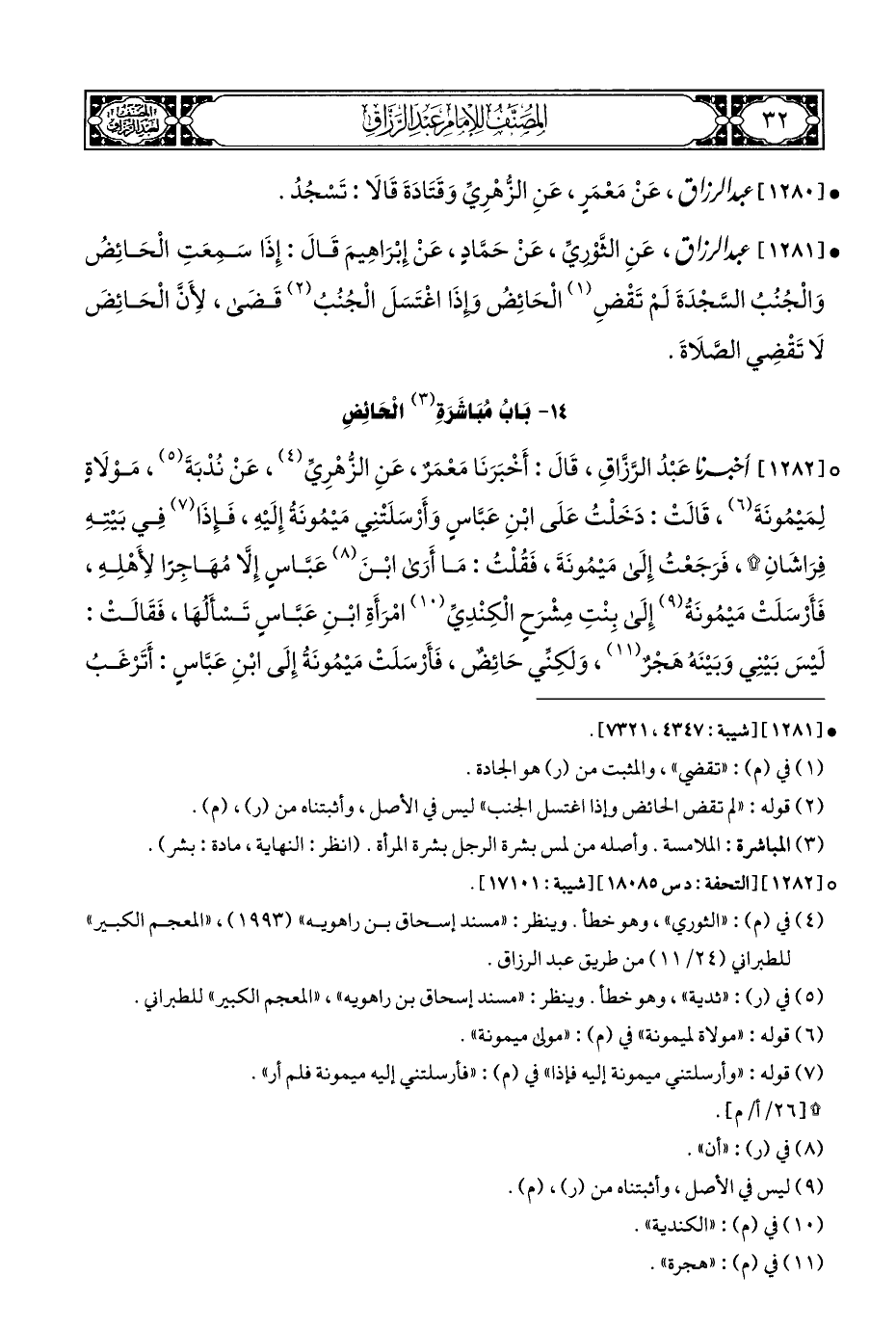 ° [١٢٨٢] أخبرنا عَبْدُ الرَّزَّاقِ، قَالَ: أَخْبَرَنَا مَعْمَرٌ، عَنِ الزُّهْرِيِّ (¬٤)، عَنْ نُدْبَةَ (¬٥)، مَوْلَاةٍ لِمَيْمُونَةَ (¬٦)، قَالَتْ: دَخَلْتُ عَلَى ابْنِ عَبَّاسٍ وَأَرْسَلَتْنِي مَيْمُونَةُ إِلَيْهِ، فَإِذَا (¬٧) فِي بَيْتِهِ فِرَاشَانِ *، فَرَجَعْتُ إِلَى مَيْمُونَةَ، فَقُلْتُ: مَا أَرَى ابْنَ (¬٨) عَبَّاسٍ إِلَّا مُهَاجِرًا لِأَهْلِهِ، فَأَرْسَلَتْ مَيْمُونَةُ (¬٩) إِلَى بِنْتِ مِشْرَحٍ الْكِنْدِيِّ (¬١٠) امْرَأَةِ ابْنِ عَبَّاسٍ تَسْأَلُهَا، فَقَالَتْ: لَيْسَ بَيْنِي وَبَيْنَهُ هَجْرٌ (¬١١)، وَلَكِنِّي حَائِضٌ، فَأَرْسَلَتْ مَيْمُونَةُ إِلَى ابْنِ عَبَّاسٍ: أَتَرْغَبُ