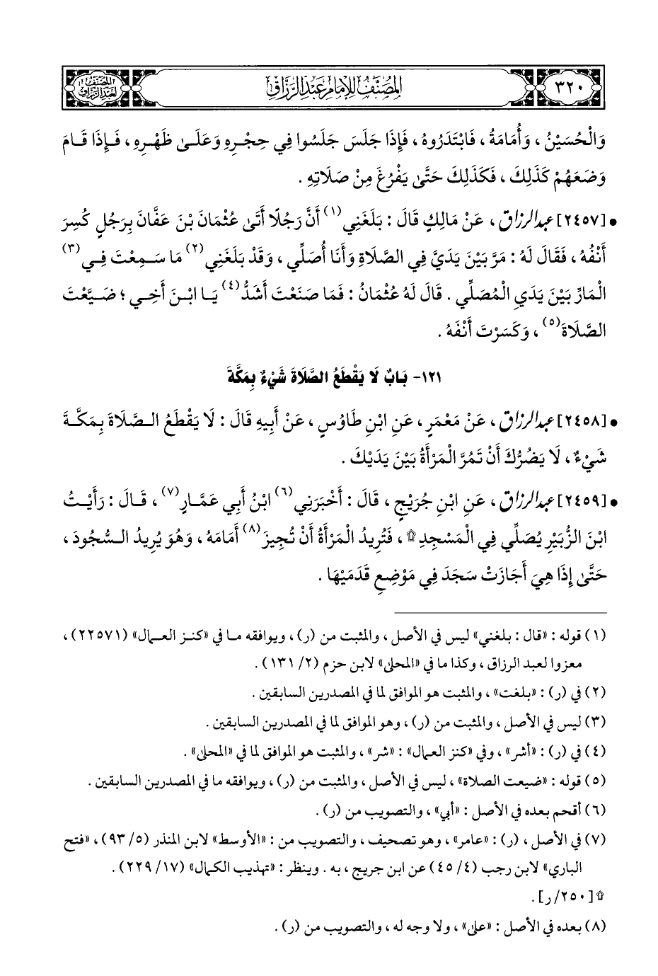 • [٢٤٥٩] عبد الرزاق، عَنِ ابْنِ جُرَيْجٍ، قَالَ: أَخْبَرَنِي (¬٦) ابْنُ أَبِي عَمَّارٍ (¬٧)، قَالَ: رَأَيْتُ ابْنَ الزُّبَيْرِ يُصَلِّي فِي الْمَسْجِدِ *، فَتُرِيدُ الْمَرْأَةُ أَنْ تُجِيزَ (¬٨) أَمَامَهُ، وَهُوَ يُرِيدُ السُّجُودَ، حَتَّى إِذَا هِيَ أَجَازَتْ سَجَدَ فِي مَوْضِعِ قَدَمَيْهَا.