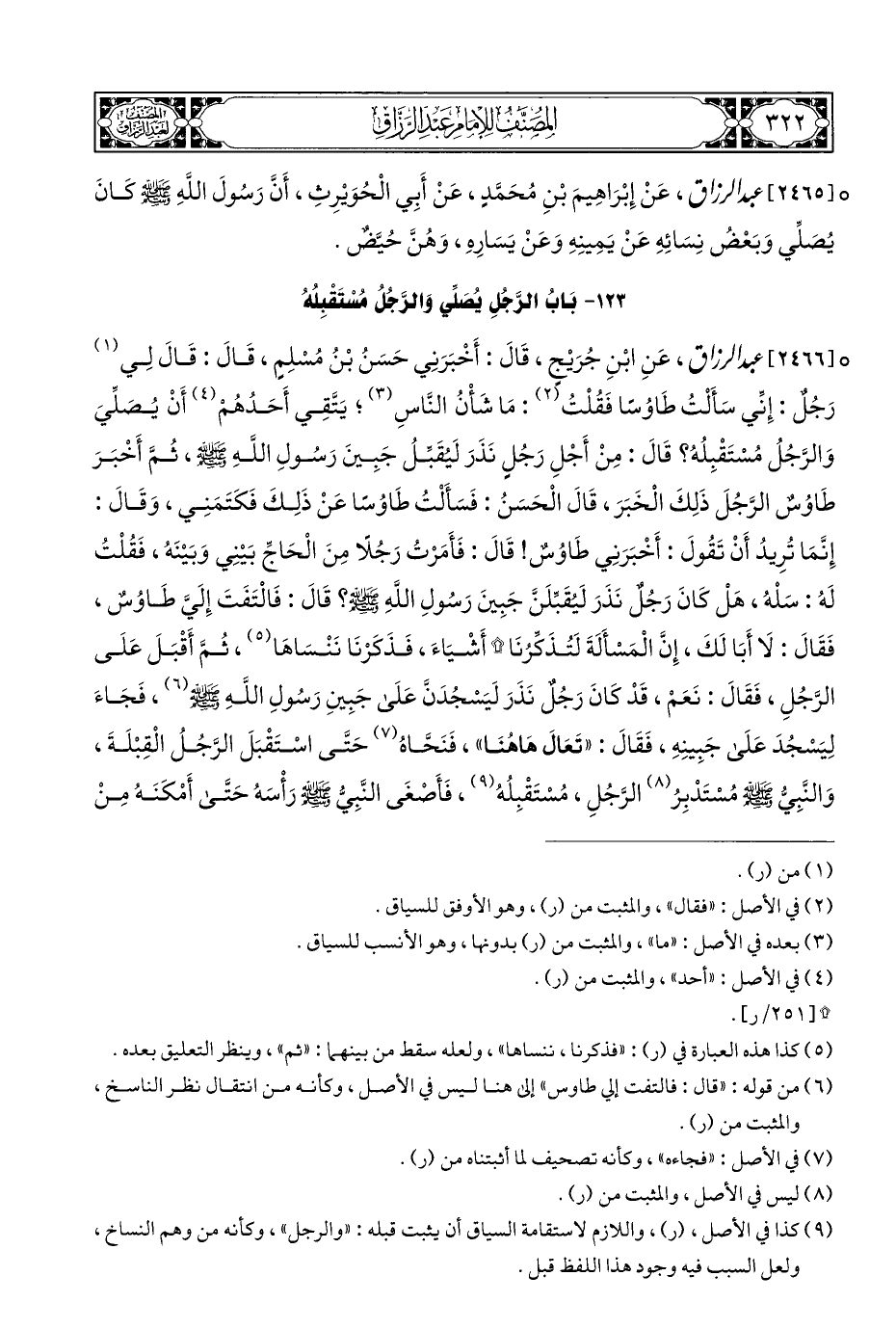 ° [٢٤٦٦] عبد الرزاق، عَنِ ابْنِ جُرَيْجٍ، قَالَ: أَخْبَرَنِي حَسَنُ بْنُ مُسْلِمٍ، قَالَ: قَالَ لِي (¬١) رَجُلٌ: إِنِّي سَأَلْتُ طَاوُسًا فَقُلْتُ (¬٢): مَا شَأْنُ النَّاسِ (¬٣)، يَتَّقِي أَحَدُهُمْ (¬٤) أَنْ يُصَلِّيَ وَالرَّجُلُ مُسْتَقْبِلُهُ؟ قَالَ: مِنْ أَجْلِ رَجُلٍ نَذَرَ لَيُقَبِّلُ جبِينَ رَسُولِ اللَّهِ - صلى الله عليه وسلم -، ثُمَّ أَخْبَرَ طَاوُسٌ الرَّجُلَ ذَلِكَ الْخَبَرَ، قَالَ الْحَسَنُ: فَسَأَلْتُ طَاوُسًا عَنْ ذَلِكَ فَكَتَمَنِي، وَقَالَ: إِنَّمَا تُرِيدُ أَنْ تَقُولَ: أَخْبَرَنِي طَاوُسٌ! قَالَ: فَأَمَرْتُ رَجُلًا مِنَ الْحَاجِّ بَيْنِي وَبَيْنَهُ، فَقُلْتُ لَهُ: سَلْهُ، هَلْ كَانَ رَجُلٌ نَذَرَ لَيُقَبِّلَنَّ جَبِينَ رَسُولِ اللَّهِ - صلى الله عليه وسلم -؟ قَالَ: فَالْتَفَتَ إِلَيَّ طَاوُسٌ، فَقَالَ: لَا أَبَا لَكَ، إِنَّ الْمَسْأَلَةَ لَتُذَكِّرُنَا * أَشْيَاءَ، فَذَكَرْنَا نَنْسَاهَا (¬٥)، ثُمَّ أَقْبَلَ عَلَى الرَّجُلِ، فَقَالَ: نَعَمْ، قَدْ كَانَ رَجُلٌ نَذَرَ لَيَسْجُدَنَّ عَلَى جَبِينِ رَسُولِ اللَّهِ - صلى الله عليه وسلم - (¬٦)، فَجَاءَ لِيَسْجُدَ عَلَى جَبِينِهِ، فَقَالَ: "تَعَالَ هَاهُنَا"، فَنَحَّاهُ (¬٧) حَتَّى اسْتَقْبَلَ الرَّجُلُ الْقِبْلَةَ، وَالنَّبِيُّ - صلى الله عليه وسلم - مُسْتَدْبِرُ (¬٨) الرَّجُلِ، مُسْتَقْبِلُهُ (¬٩)، فَأَصْغَى النَّبِيُّ - صلى الله عليه وسلم - رَأْسَهُ حَتَّى أَمْكَنَهُ مِنْ