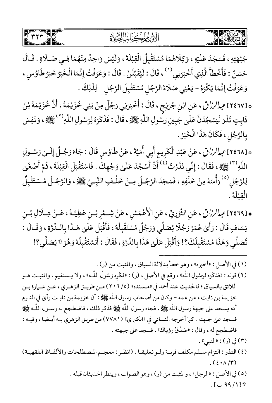 ° [٢٤٦٨] عبد الرزاق، عَنْ عَبْدِ الْكَرِيمِ أَبِي أُمَيَّةَ، عَنْ طَاوُسٍ قَالَ: جَاءَ رَجُلٌ إِلَى رَسُولِ اللَّهِ (¬٣) - صلى الله عليه وسلم -، فَقَالَ: إِنِّي نَذَرْتُ (¬٤) أَنْ أَسْجُدَ عَلَى وَجْهِكَ. فَاسْتَقْبَلَ الْقِبْلَةَ، ثُمَّ أَصْغَى لِلرَّجُلِ (¬٥) رَأْسَهُ مِنْ خَلْفِهِ، فَسَجَدَ الرَّجُلُ مِنْ خَلْفِ النَّبِيِّ - صلى الله عليه وسلم -، وَالرَّجُلُ مُسْتَقْبِلٌ الْقِبْلَةَ.