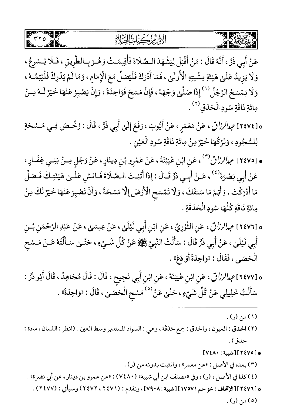 ° [٢٤٧٤] عبد الرزاق، عَنْ مَعْمَرٍ، عَنْ أَيُّوبَ، رَفَعَ إِلَى أَبِي ذرٍّ، قَالَ: رُخِّصَ فِي مَسْحَةٍ لِلسُّجُودِ، وَتَرْكُهَا خَيْرٌ مِنْ مِالةِ نَاقَةٍ سُودِ الْعَيْنِ.