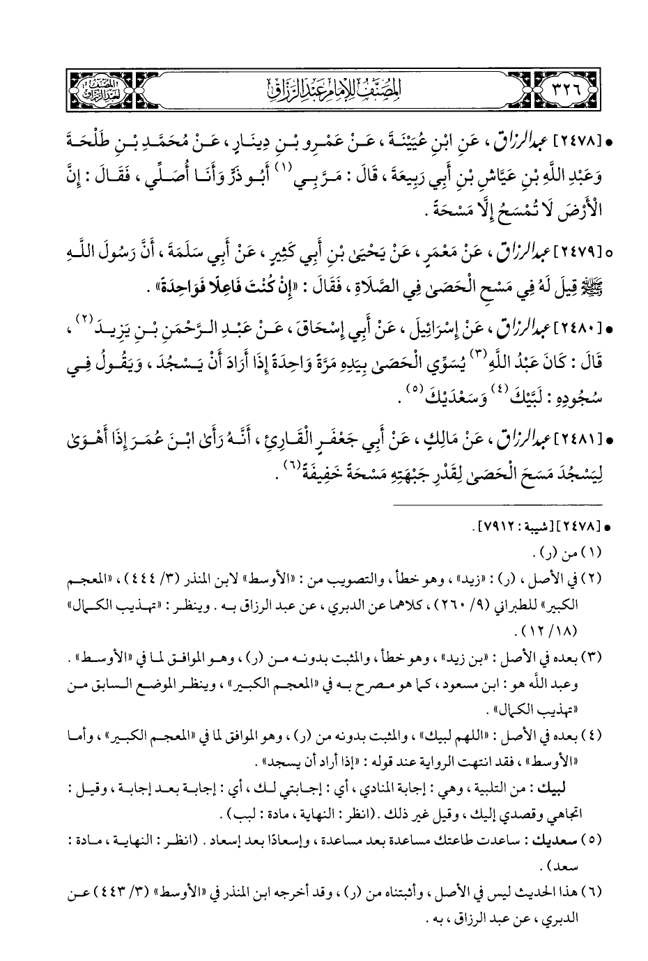• [٢٤٨٠] عبد الرزاق، عَنْ إِسْرَائِيلَ، عَنْ أَبِي إِسْحَاقَ، عَنْ عَبْدِ الرَّحْمَنِ بْنِ يَزِيدَ (¬٢)، قَالَ: كَانَ عَبْدُ اللَّهِ (¬٣) يُسَوِّي الْحَصَى بِيَدِهِ مَرَّةَ وَاحِدَةً إِذَا أَرَادَ أَنْ يَسْجُدَ، وَيَقُولُ فِي سُجودِهِ: لبَّيْكَ (¬٤) وَسَعْديْك (¬٥).