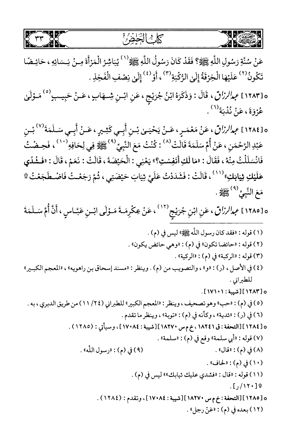 ° [١٢٨٤] عبد الرزاق، عَنْ مَعْمَرٍ، عَنْ يَحْيَى بْنِ أَبِي كَثِيرٍ، عَنْ أَبِي سَلَمَةَ (¬٧) بْنِ عَبْدِ الرَّحْمَنِ، عَنْ أُمِّ سَلَمَةَ قَالَتْ (¬٨): كُنْتُ مَعَ النَّبِيِّ (¬٩) - صلى الله عليه وسلم - في لِحَافِهِ (¬١٠)، فَحِضْتُ فَانْسَلَلْتُ مِنْهُ، فَقَالَ: "مَا لَكِ أَنَفِسْتِ؟ " يَعْنِي: الْحَيْضَةَ، قَالَتْ: نَعَمْ، قَالَ: "فَشُدِّي عَلَيْكِ ثِيَابَكِ" (¬١١)، قَالَتْ: فَشَدَدْتُ عَلَيَّ ثِيَابَ حَيْضَتِي، ثُمَّ رَجَعْتُ فَاضْطَجَعْتُ * مَعَ النَّبِيِّ (¬٩) - صلى الله عليه وسلم -.
