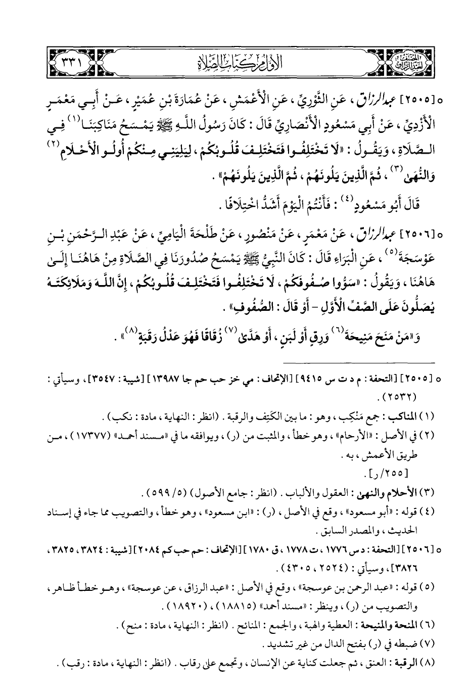 ° [٢٥٠٥] عبد الرزاق، عَنِ الثَّوْريِّ، عَنِ الْأَعْمَشِ، عَنْ عُمَارَةَ بْنِ عُمَيْرٍ، عَنْ أَبِي مَعْمَرٍ الْأَزْدِيِّ، عَنْ أَبِي مَسْعُودٍ الْأَنْصَارِيِّ قَالَ: كَانَ رَسُولُ اللَّهِ - صلى الله عليه وسلم - يَمْسَحُ مَنَاكِبَنَا (¬١) فِي الصَّلَاةِ، وَيَقُولُ: "لَا تَخْتَلِفُوا فَتَخْتَلِفَ قُلُوبُكُمْ، ليَلِيَنِي مِنْكُمْ أُولُو الْأَحْلَامِ (¬٢) وَالنُّهَى (¬٣)، ثُمَّ الَّذِينَ يَلُونَهُمْ، ثُمَّ الَّذِينَ يَلُونَهُمْ".