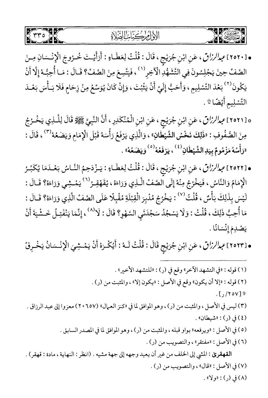 • [٢٥٢٢] عبد الرزاق عَنِ ابْنِ جُرَيْجٍ، قَالَ: قُلْتُ لِعَطَاءٍ: يَزْدَحِمُ النَّاسُ بَعْدَمَا يُكَبِّرُ الْإِمَامُ وَالنَّاسُ، فَيَخْرُجُ مِنْهُ إِلَى الصَّفِّ الَّذِي وَرَاءَهُ، يُقَهْقِرُ (¬٦) يَمْشِي وَرَاءَهُ؟ قَالَ: لَيْسَ بِذَلِكَ بَأْسٌ، قُلْتُ (¬٧): يَخْرُجُ مُدْبِرَ الْقِبْلَةِ مُقْبِلًا عَلَى الصَّفِّ الَّذِي وَرَاءَهُ؟ قَالَ: مَا أُحِبُّ ذَلِكَ، قُلْتُ: وَلَا يَسْجُدُ سَجْدَتَيِ السَّهْوِ؟ قَالَ: لَا (¬٨)، إِنَّمَا يَنْفَتِلُ خَشْيَةَ أَنْ يَصْدِمَ إِنْسَانًا.