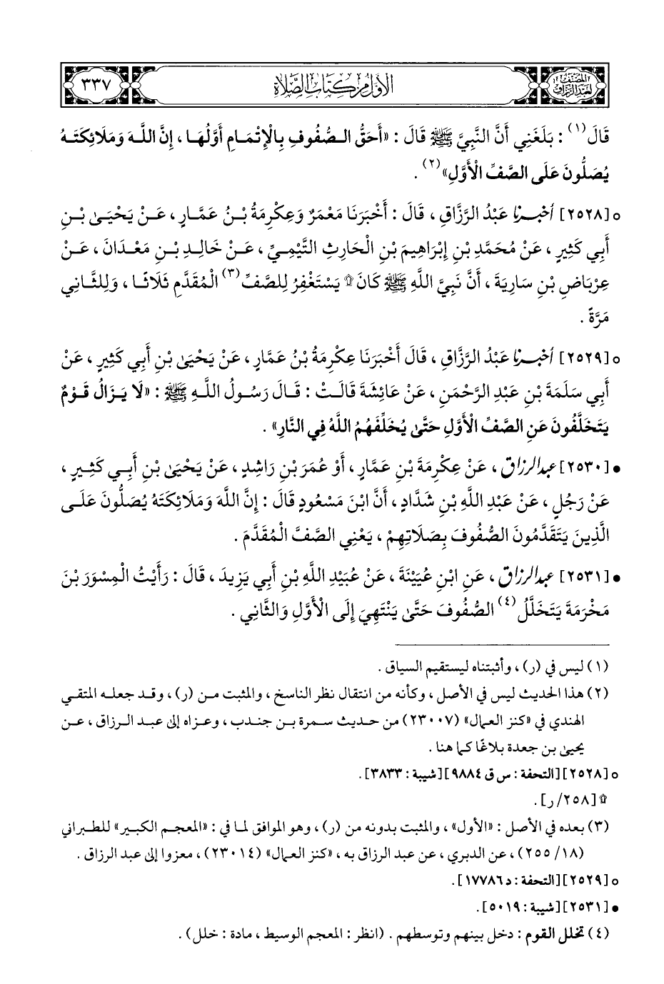 ° [٢٥٢٨] أخبرنا عَبْدُ الرَّزَّاقِ، قَالَ: أَخْبَرَنَا مَعْمَرٌ وَعِكْرِمَةُ بْنُ عَمَّارٍ، عَنْ يَحْيَى بْنِ أَبِي كَثِيرٍ، عَنْ مُحَمَّدِ بْنِ إِبْرَاهِيمَ بْنِ الْحَارِثِ التَّيْمِيِّ، عَنْ خَالِدِ بْنِ مَعْدَانَ، عَنْ عَرْبَاضِ بْنِ سَارِيَةَ، أَنَّ نَبِيَّ اللَّهِ - صلى الله عليه وسلم - كَانَ * يَسْتَغْفِرُ لِلصَّفِّ (¬٣) الْمُقَدَّمِ ثَلَاثًا، وَلِلثَّانِي مَرَّةً.