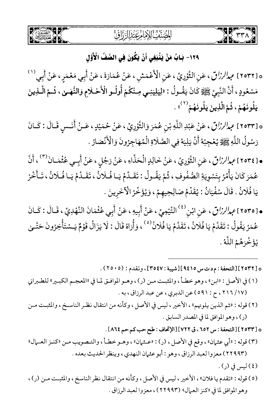 ° [٢٥٣٣] عبد الرزاق، عَنْ عَبْدِ اللَّهِ بْنِ عُمَرَ وَالثَّوْرِيِّ، عَنْ حُمَيْدٍ، عَنْ أَنَسِ قَالَ: كَانَ رَسُولُ اللَّهِ - صلى الله عليه وسلم - يُعْجِبُهُ أَنْ يَلِيَهُ فِي الصَّلَاةِ الْمُهَاجِرُونَ وَالْأَنْصَارُ.