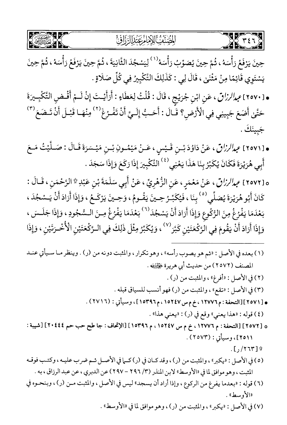° [٢٥٧٢] عبد الرزاق، عَنْ مَعْمَرٍ، عَنِ الزُّهْرِيِّ، عَنْ أَبِي سَلَمَةَ بْنِ عَبْدِ * الرَّحْمَنِ، قَالَ: كَانَ أَبُو هُرَيْرَةَ يُصَلِّي (¬٥) بِنَا، فَيُكَبِّرُ حِينَ يَقُومُ، وَحِينَ يَرْكَعُ، وإِذَا أَرَادَ أَنْ يَسْجُدَ، بَعْدَمَا يَفْرُغُ مِنَ الرُّكُوعِ وإِذَا أَرَادَ أَنْ يَسْجُدَ (¬٦) بَعْدَمَا يَفْرُغُ مِنَ السُّجُودِ، وإِذَا جَلَسَ، وإِذَا أَرَادَ أَنْ يَقُومَ فِي الرَّكْعَتَيْنِ كَبَّرَ (¬٧)، وَيُكَبِّرُ مِثْلَ ذَلِكَ فِي الرَّكْعَتَيْنِ الْأُخْرَتَيْنِ، وإِذَا