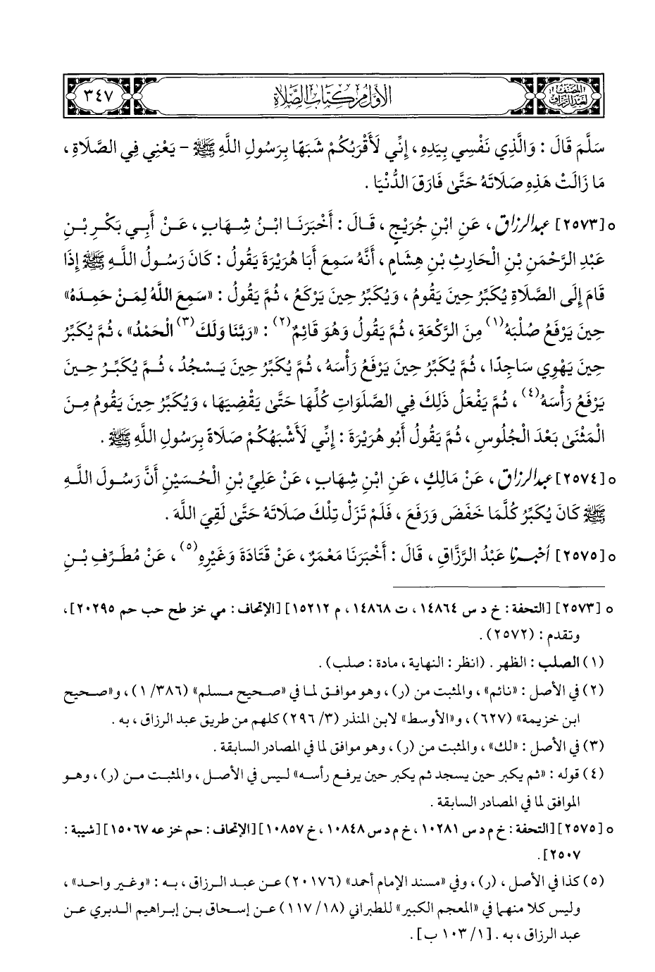 ° [٢٥٧٣] عبد الرزاق، عَنِ ابْنِ جُرَيْجٍ، قَالَ: أَخْبَرَنَا ابْنُ شِهَابٍ، عَنْ أَبِي بَكْرِ بْنِ عَبْدِ الرَّحْمَنِ بْنِ الْحَارِثِ بْنِ هِشَامٍ، أَنَّهُ سَمِعَ أَبَا هُرَيْرَةَ يَقُولُ: كَانَ رَسُولُ اللهِ - صلى الله عليه وسلم - إِذَا قَامَ إِلَى الصَّلَاةِ يُكَبِّرُ حِينَ يَقُومُ، وَيُكَبِّرُ حِينَ يَرْكَعُ، ثُمَّ يَقُولُ: "سَمِعَ اللَّهُ لِمَنْ حَمِدَهُ" حِينَ يَرْفَعُ صُلْبَهُ (¬١) مِنَ الرَّكْعَةِ، ثُمَّ يَقُولُ وَهُوَ قَائِمٌ (¬٢): "رَبَّنَا وَلَكَ (¬٣) الْحَمْدُ"، ثُمَّ يُكَبِّرُ حِينَ يَهْوِي سَاجِدًا، ثُمَّ يُكَبِّرُ حِينَ يَزفَعُ رَأْسَهُ، ثُمَّ يُكَبِّرُ حِينَ يَسْجُدُ، ثُمَّ يُكَبِّرُ حِينَ يَرْفَعُ رَأْسَهُ (¬٤)، ثُمَّ يَفْعَلُ ذَلِكَ فِي الصَّلَوَاتِ كُلِّهَا حَتَّى يَقْضِيَهَا، وَيُكَبِّرُ حِينَ يَقُومُ مِنَ الْمَثْنَى بَعْدَ الْجُلُوسِ، ثُمَّ يَقُولُ أَبُو هُرَيْرَةَ: إِنَي لأَشْبَهُكُمْ صَلَاةَ بِرَسُولِ اللَّهِ - صلى الله عليه وسلم -.