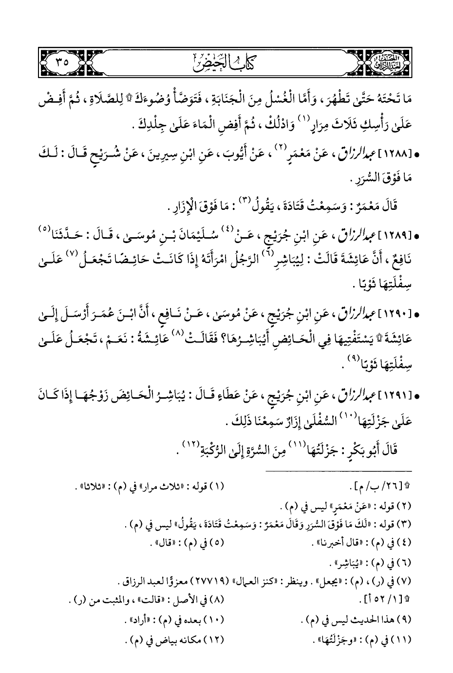 • [١٢٩٠] عبد الرزاق، عَنِ ابْنِ جُرَيْجٍ، عَنْ مُوسَى، عَنْ نَافِعٍ، أَنَّ ابْنَ عُمَرَ أَرْسَلَ إِلَى عَائِشَةَ * يَسْتَفْتِيهَا فِي الْحَائِضِ أَيُبَاشِرُهَا؟ فَقَالَتْ (¬٨) عَائِشَةُ: نَعَمْ، تَجْعَلُ عَلَى سِفْلَتِهَا ثَوْبًا (¬٩).